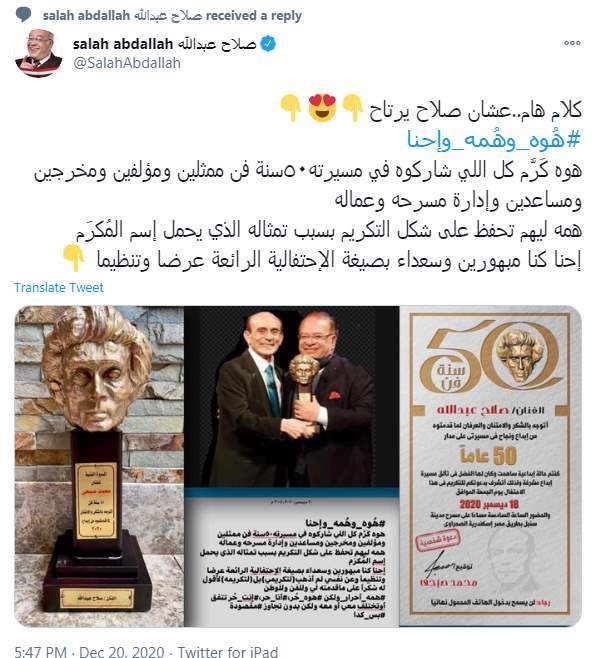 ونشر صلاح عبد الله صور التكريم معلقا عليها: "كلام هام.. عشان صلاح يرتاح #هُوه_وهُمه_وإحنا .. هوه كَرَّم كل اللي شاركوه في مسيرته ٥٠ سنة فن ممثلين ومؤلفين ومخرجين ومساعدين وإدارة مسرحه وعماله.. همه ليهم تحفظ على شكل التكريم بسبب تمثاله الذي يحمل اسم المُكرَم.. إحنا كنا مبهورين وسعداء بصيغة الاحتفالية الرائعة عرضا وتنظيما".