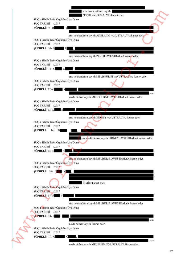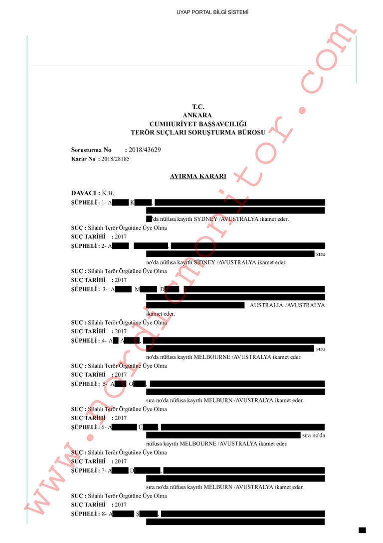 وفقًا لقرار صادر عن المدعي العام أكينجي في 19 ديسمبر 2018 ، فتح مكتب المدعي العام في أنقرة تحقيقًا منفصلاً مع 64 مواطنًا تركيًا وأستراليًا تم إدراجهم في ملفات التجسس التي أرسلها دبلوماسيون أتراك في البلاد دون أي دليل ملموس على ارتكاب مخالفة، ووجهت إليهم تهمة "الانتماء إلى جماعة إرهابية" من قبل أكينجي.