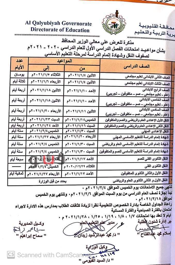 اعتمد عبد الحميد الهجان محافظ القليوبية جدول امتحانات نصف العام يناير ٢٠٢١ على مستوى المحافظة، مؤكدا ضرورة الاستعداد التام واتخاذ التدابير اللازمة لتوفير الجو الملائم للطلبة لتأدية الامتحانات بسهولة ويسر، مشددا على ضرورة الالتزام بالإجراءات الوقائية والاحترازية المشددة للوقاية من الإصابة بعدوى فيروس كورونا.