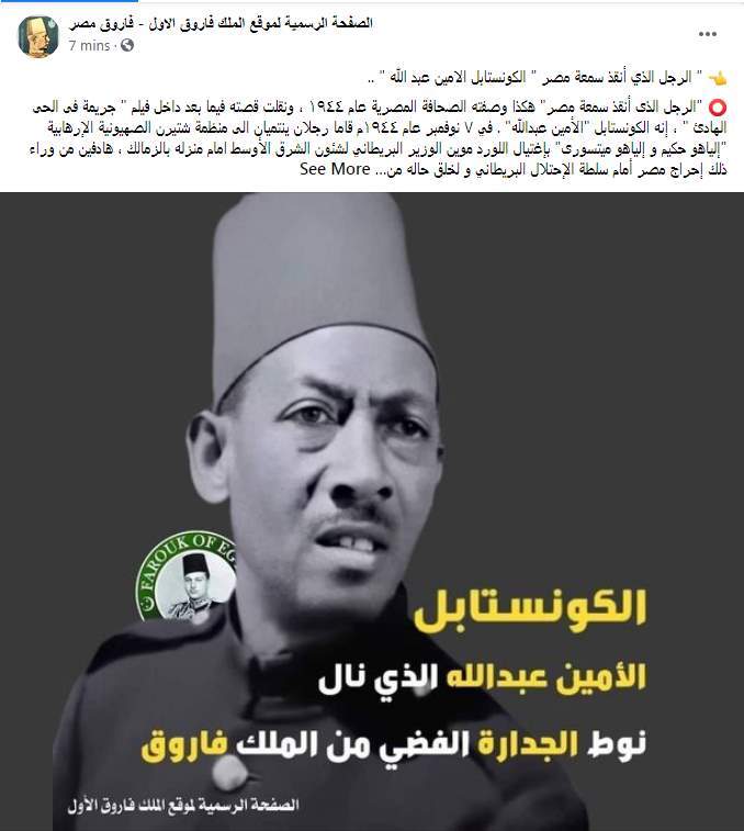 كشفت الصفحة الرسمية لموقع الملك فاروق، عبر فيس بوك، عن الرجل الذي أنقذ سمعة مصر وهو الكونستابل الأمين عبد الله، كما وصفته الصحافة المصرية عام ١٩٤٤، فقد صار حديث مصر كلها بعد أن تمكن من القبض على شخصين ينتميان لمنظمة صهيونية قتلا اللورد موين الوزير البريطاني لشئون الشرق الأوسط أمام منزله بالزمالك، في محاولة لإحراج مصر، لكن الكونستابل تمكن من إنقاذ سمعة مصر.