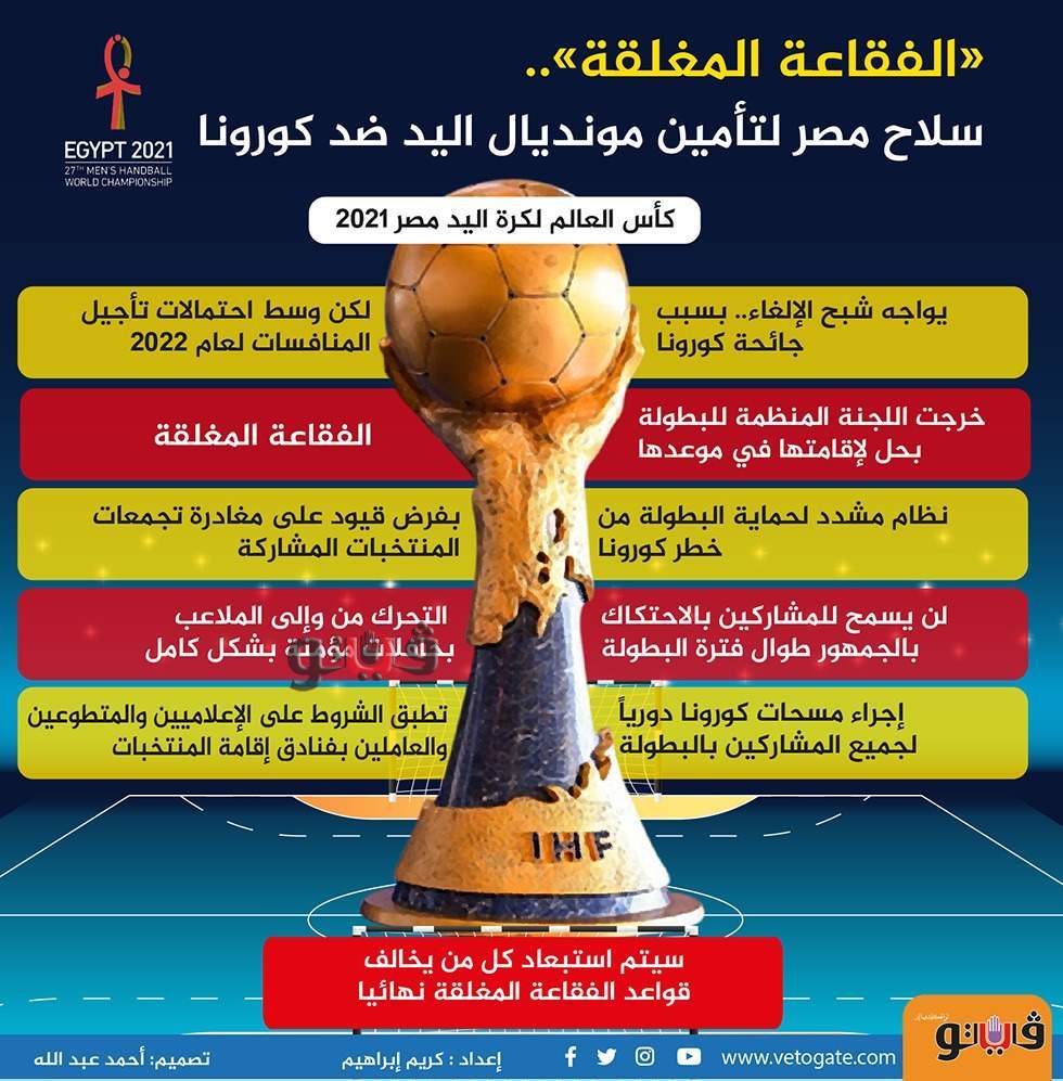 «الفقاعة المغلقة».. سلاح مصر لتأمين مونديال اليد ضد كورونا| إنفوجراف الإثنين 21/ديسمبر/2020 - 01:19 م 12/21/2020 1:19:09 PM «الفقاعة المغلقة».. سلاح مصر لتأمين مونديال اليد شارك طباعة 18 حجم الخط شارك طباعة فيروس كورونا كورونا مونديال اليد مصر 2021 كأس العالم لكرة اليد