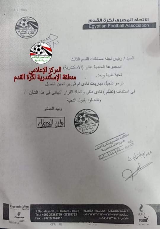 أرسل اليوم الاثنين اتحاد الكرة خطابا إلى مسئولي فرع الإسكندرية يطالبه بتأجيل مباريات فريق إم في بي في مسابقة دورى القسم الثالث.