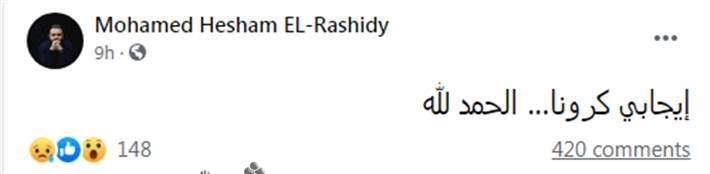 فى هذا السياق، كتب محمد هشام، عبر حسابه الرسمي على التواصل الإجتماعي "فيس بوك": "إيجابي كورونا.. الحمدلله".
