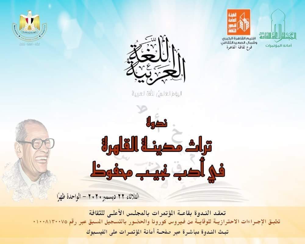 في إطار الاحتفال بـ"اليوم العالمي للغة العربية" يقيم المجلس الأعلى للثقافة بأمانة الدكتور هشام عزمي بالتعاون مع فرع ثقافة القاهرة بالهيئة العامة لقصور الثقافة برئاسة الدكتور أحمد عواض ندوة ثقافية بعنوان: «تراث مدينة القاهرة في أدب نجيب محفوظ».