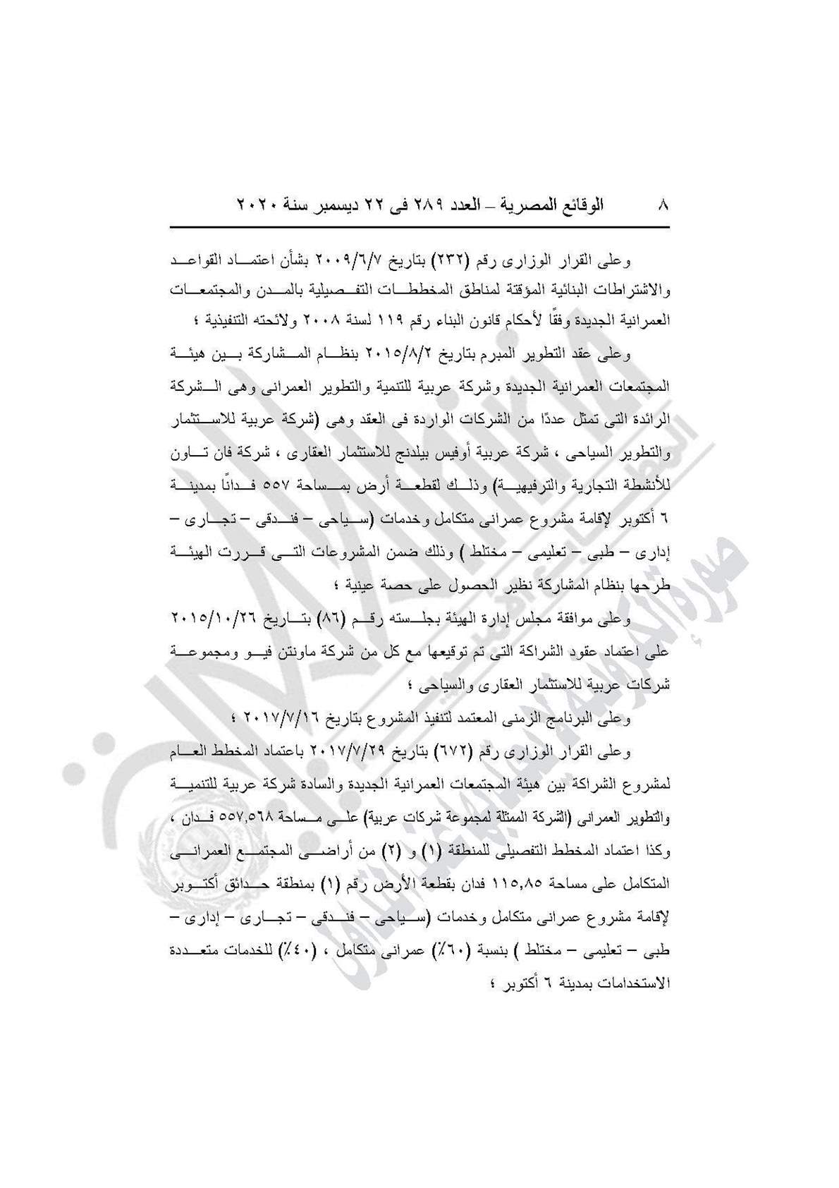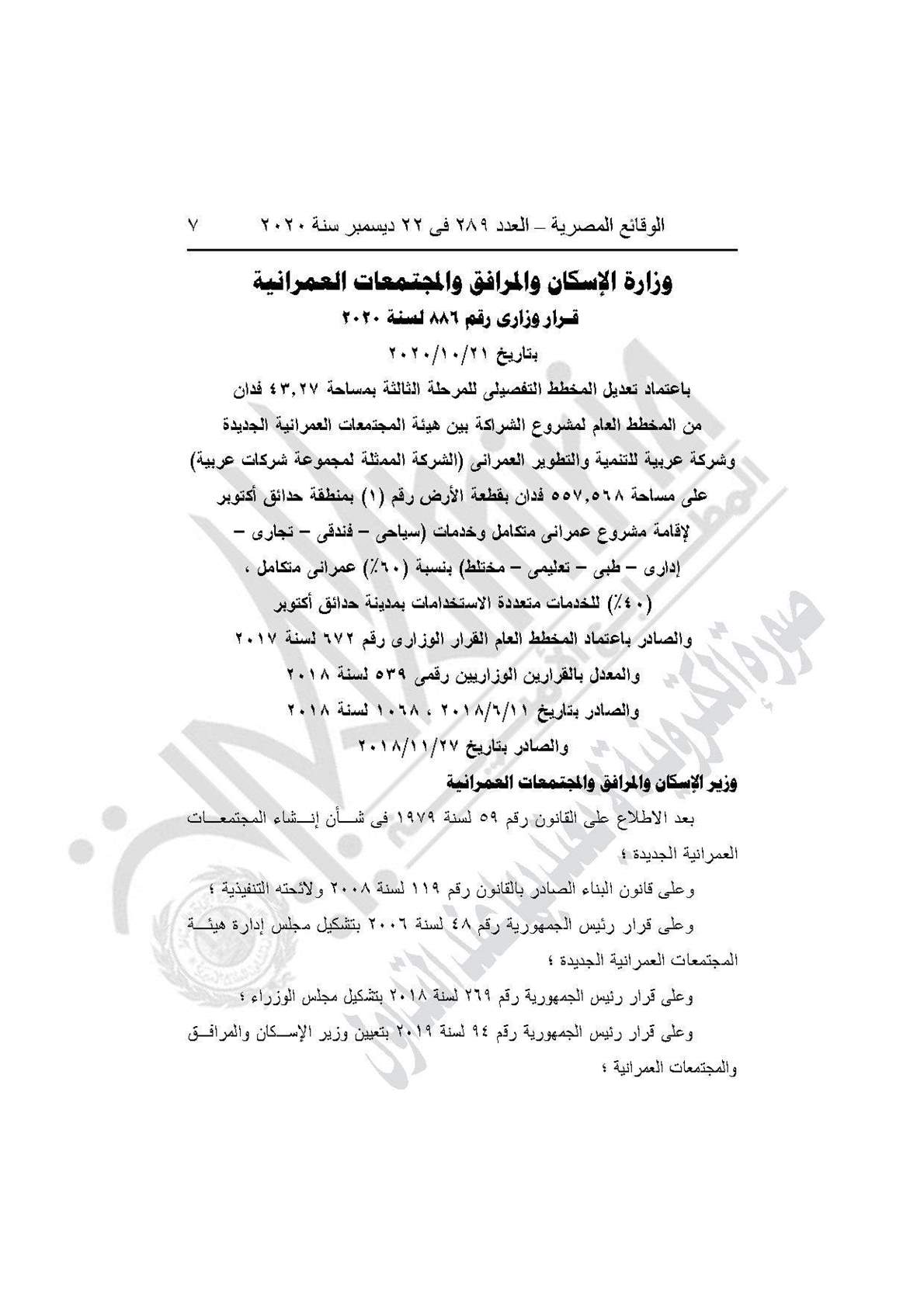 نشرت جريدة الوقائع المصرية في عددها رقم 289، الصادر في 22 ديسمبر 2020، قرار وزارة الإسكان والمرافق والمجتمعات العمرانية رقم 886 لسنة 2020، بشأن اعتماد تعديل المخطط التفصيلي للمرحلة الثالثة من المخطط العام لمشروع الشراكة بين هيئة المجتمعات العمرانية الجديدة وشركة عربية للتنمية والتطوير العمراني بمنطقة حدائق أكتوبر لإقامة مشروع عمراني متكامل وخدمات.