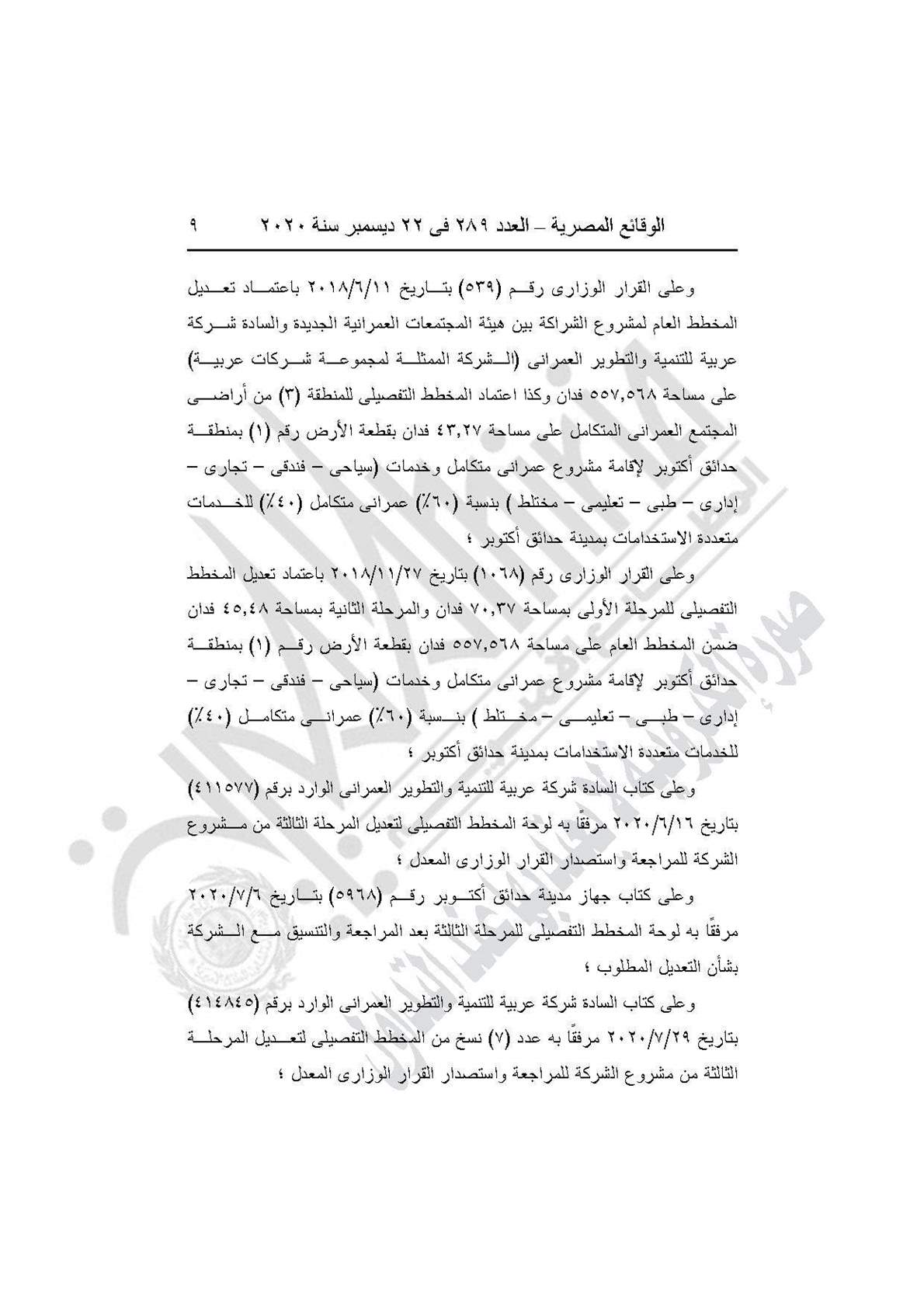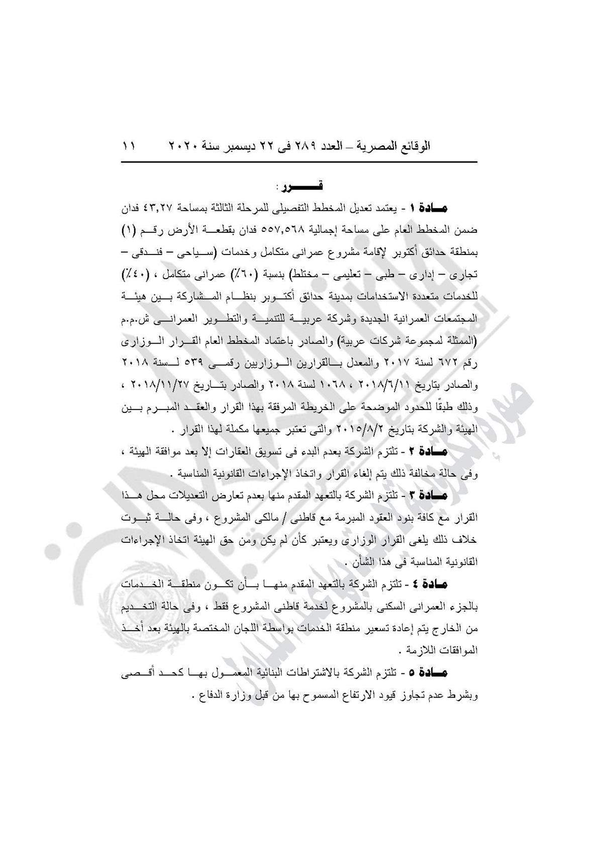 وينص القرار على اعتماد تعديل المخطط التفصيلي للمرحلة الثالثة بمساحة 43.27 فدان من المخطط العام لمشروع الشراكة بين هيئة المجتمعات العمرانية الجديدة وشركة عربية للتنمية والتطوير العمراني (الشركة العربية الممثلة لمجموعة شركات عربية) على مساحة 557.568 فدان بقطعة الأرض رقم (1) بمنطقة حدائق أكتوبر لإقامة مشروع عمراني متكامل وخدمات (سياحي- فندقي- تجاري- إداري- طبي تعليمي مختلط) بنسبة 60% عمراني متكامل، 40% للخدمات متعددة الاستخدامات بمدينة حدائق أكتوبر.