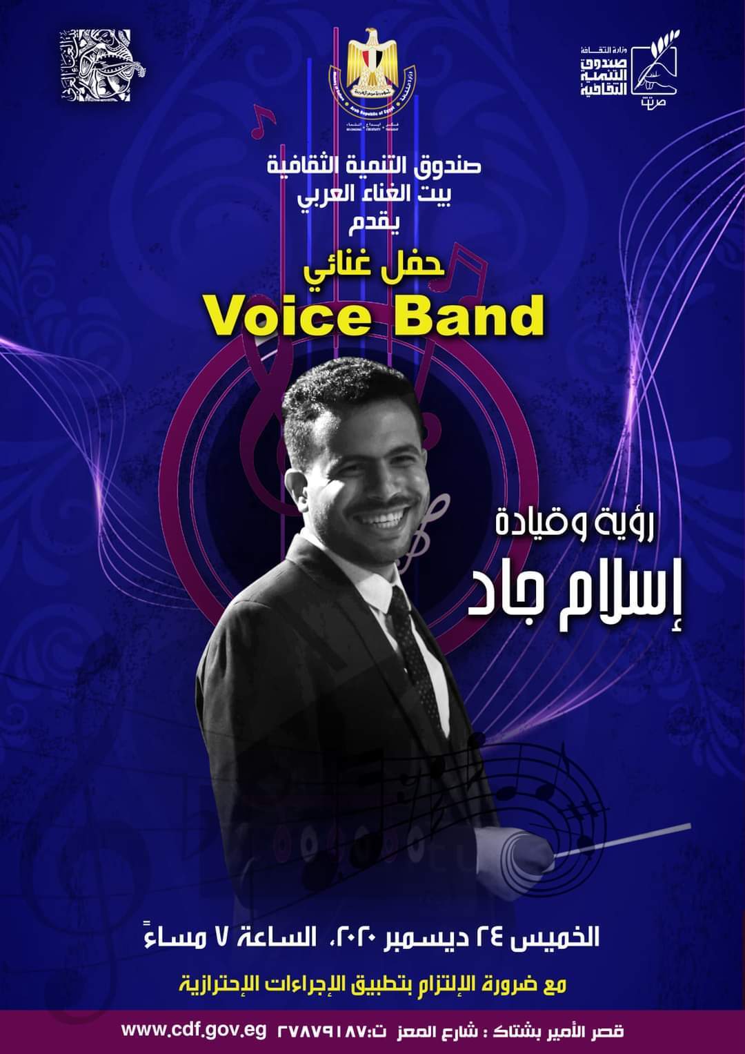يقيم مركز إبداع قصر الأمير بشتاك بشارع المعز، التابع لقطاع صندوق التنمية الثقافية حفل فرقة "فويس باند" تحت قيادة إسلام جاد، وذلك في السابعة من مساء الخميس المقبل الموافق 24 ديسمبر الجاري.