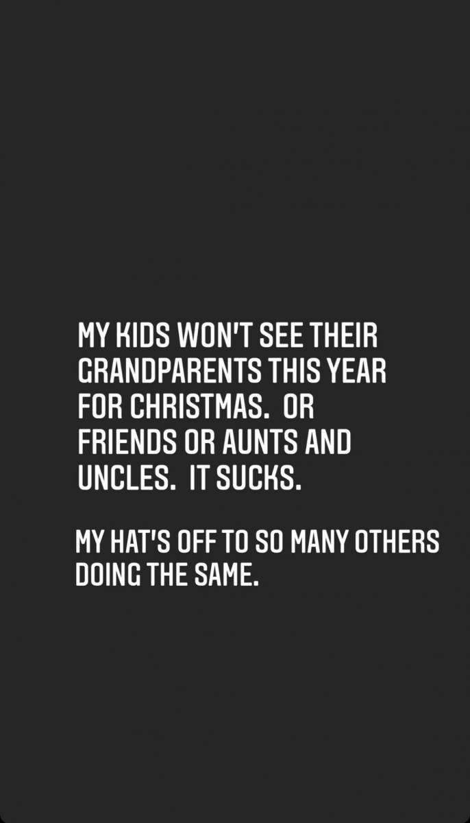 وكتب ريان عبر حسابه الشخصي بموقع تبادل الصور والفيديوهات "إنستجرام" : "لن يتمكن أطفالي من رؤية أجدادهم في احتفالات الكريسماس هذا العام"، وتابع قائلا: "ولا أصدقاء ولا عمات ولا أعمام، إنه أمر مؤسف".