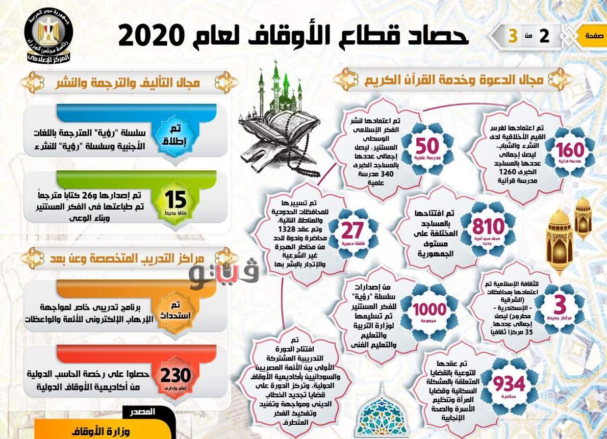 نشر المركز الإعلامي لمجلس الوزراء، تقريراً تضمن إنفوجرافات تسلط الضوء على حصاد قطاع الأوقاف لعام 2020.