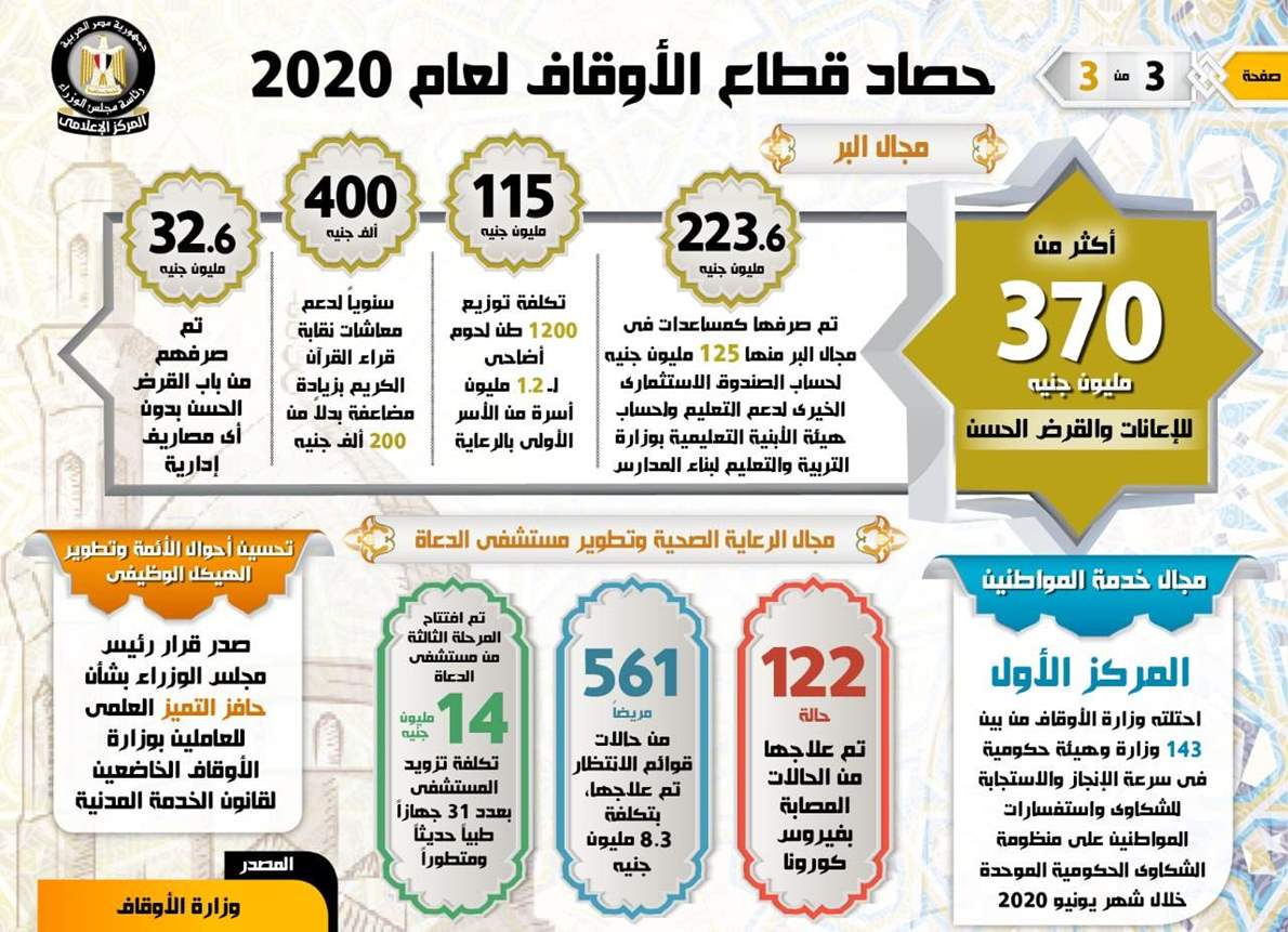 وفي إطار سلسلة متتابعة من التقارير لرصد إنجازات الحكومة في 2020، نشر المركز الإعلامي لمجلس الوزراء، تقريراً تضمن إنفو جرافات تسلط الضوء على حصاد قطاع الأوقاف لعام 2020.