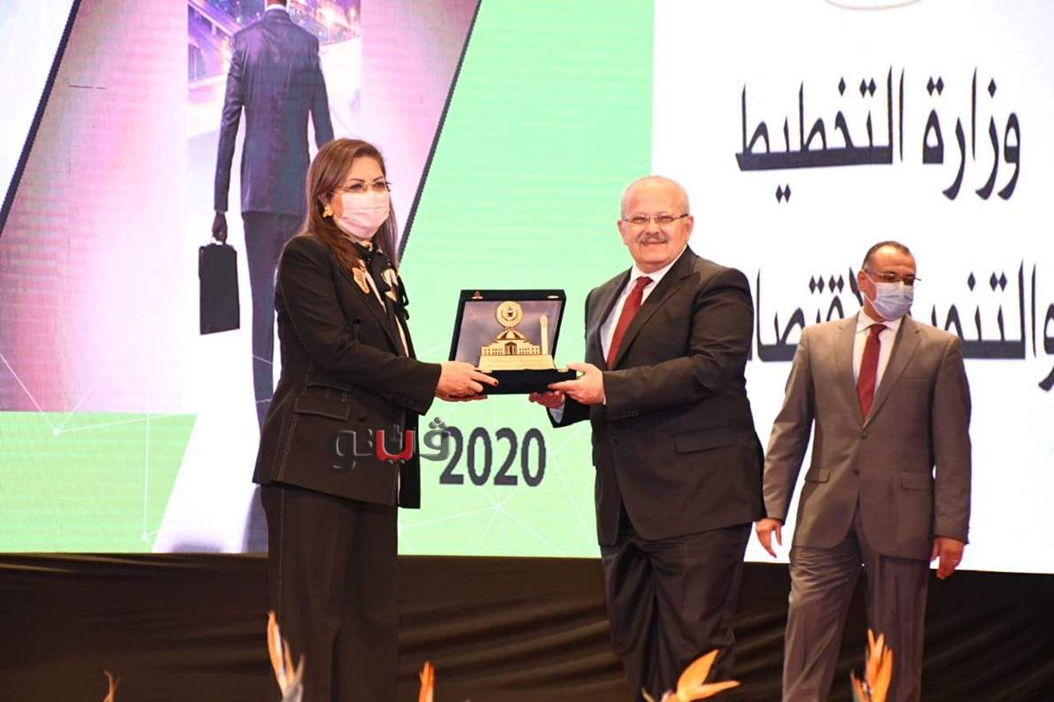 جامعة القاهرة تهدي هالة السعيد درع الجامعة لحصولها على جائزة أفضل وزير عربي