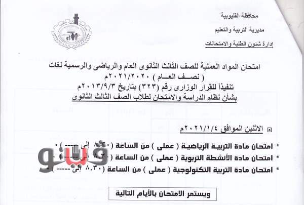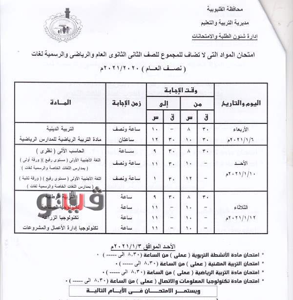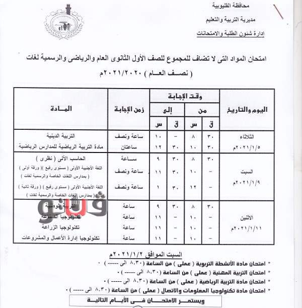 أعلنت مديرية التربية والتعليم بالقليوبية اعتماد جداول امتحانات نصف العام للمواد العملية والتي لا تضاف للمجموع لصفوف التعليم الثانوي العام والمقررة يوم 4 يناير 2021 لمواد التربية الرياضية والانشطة التربوية والتربية والتكنولوجية علي ان تبدأ الساعة الثامنه والنصف صباحا وسط الإجراءات الاحترازية المتبعه لمنع تفشي فيروس كورونا المستجد.
