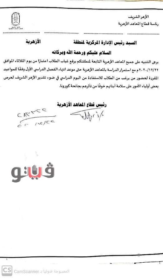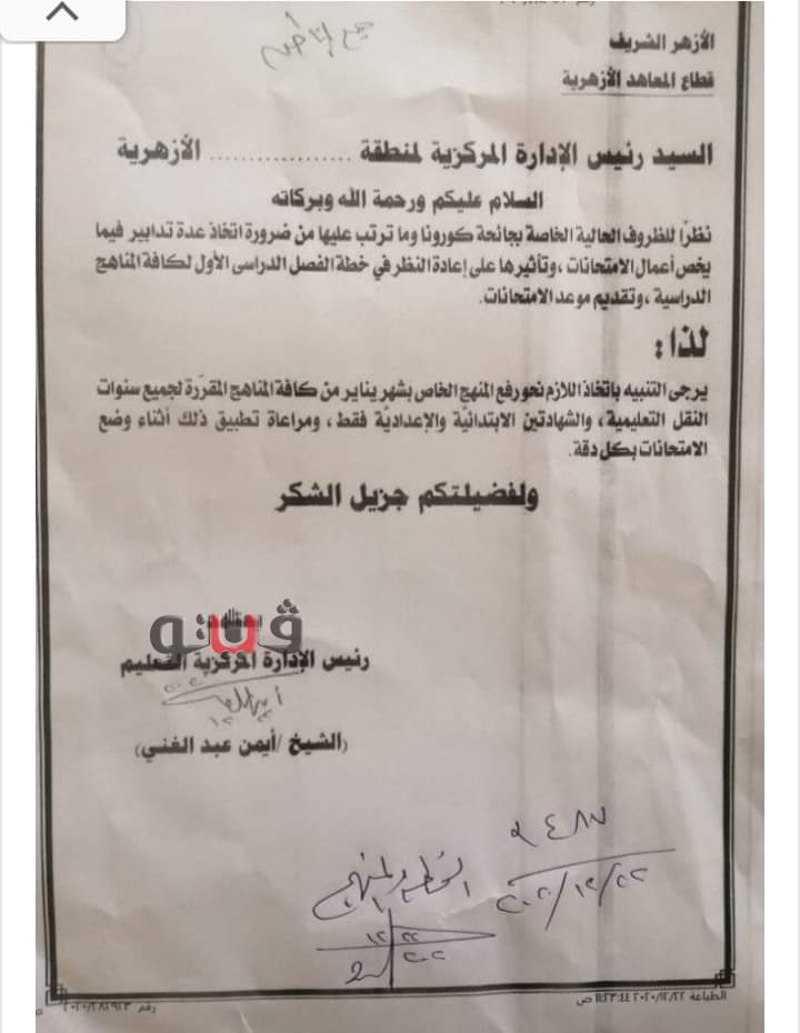 وكان قطاع المعاهد الأزهرية قد أرسل منشورا إلى جميع المعاهد الأزهرية بالتنبيه على جميع المعاهد بالانتهاء من جميع المناهج الدراسية لجميع المراحل ( ابتدائى – إعدادى ) فى موعد غايته 31 – 12 – 2020 على أن تبدأ المراجعات النهائية والاستعدادات لامتحانات الفصل الدراسى الاول ونظرا لبدء امتحانات الصفين الرابع والخامس الابتدائى يوم 9 – 1 – 2021.