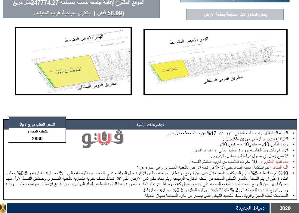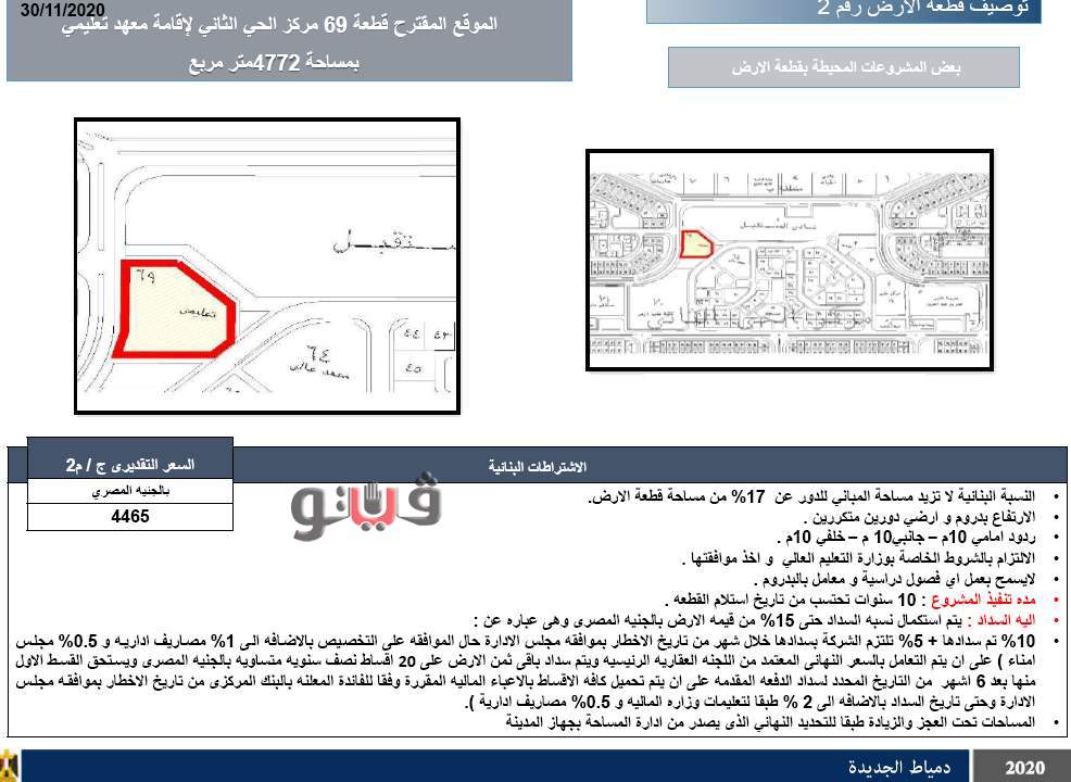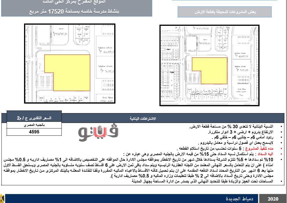 وتطرح بمدينة دمياط الجديدة أرضا بمساحة 58.9 فدان بنشاط تعليمي بسعر 2830 بقسمة 700 مليون 4772 مترا تعليمي بسعر 4465 بقيمة 21 مليون جنيه وأرضا بمساحة 651 مترا بنشاط تجاري إداري بسعر 29125 جنيها للمتر بقيمة 18.9 مليون جنيه.