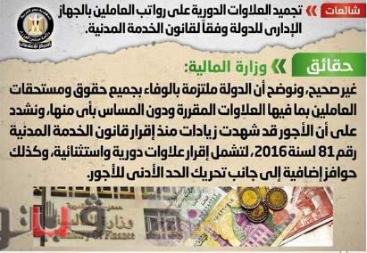 نفي المركز الاعلامي بمجلس الوزراء ما انتشر في بعض المواقع الإلكترونية وصفحات التواصل الاجتماعي من أنباء بشأن تجميد العلاوات الدورية على رواتب العاملين بالجهاز الإداري للدولة وفقاً لقانون الخدمة المدنية.
