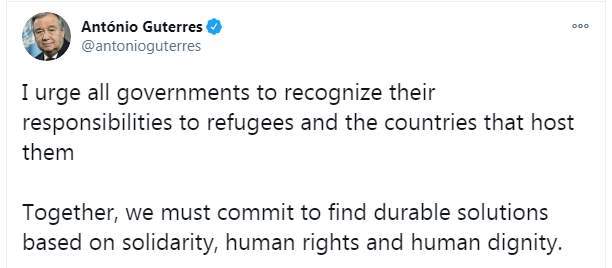 وكتب أنطونيو جوتيريش تغريدة على تويتر "أحث جميع الحكومات على الاعتراف بمسؤولياتها تجاه اللاجئين والدول التي تستضيفهم"
