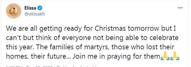 وكتبت إليسا تغريدة على تويتر "نستعد جميعًا لعيد الميلاد غدًا ولكن لا يسعني إلا التفكير في عدم قدرة الجميع على الاحتفال هذا العام. أهالي الشهداء الذين فقدوا بيوتهم ومستقبلهم... انضموا إليّ في الدعاء لهم"