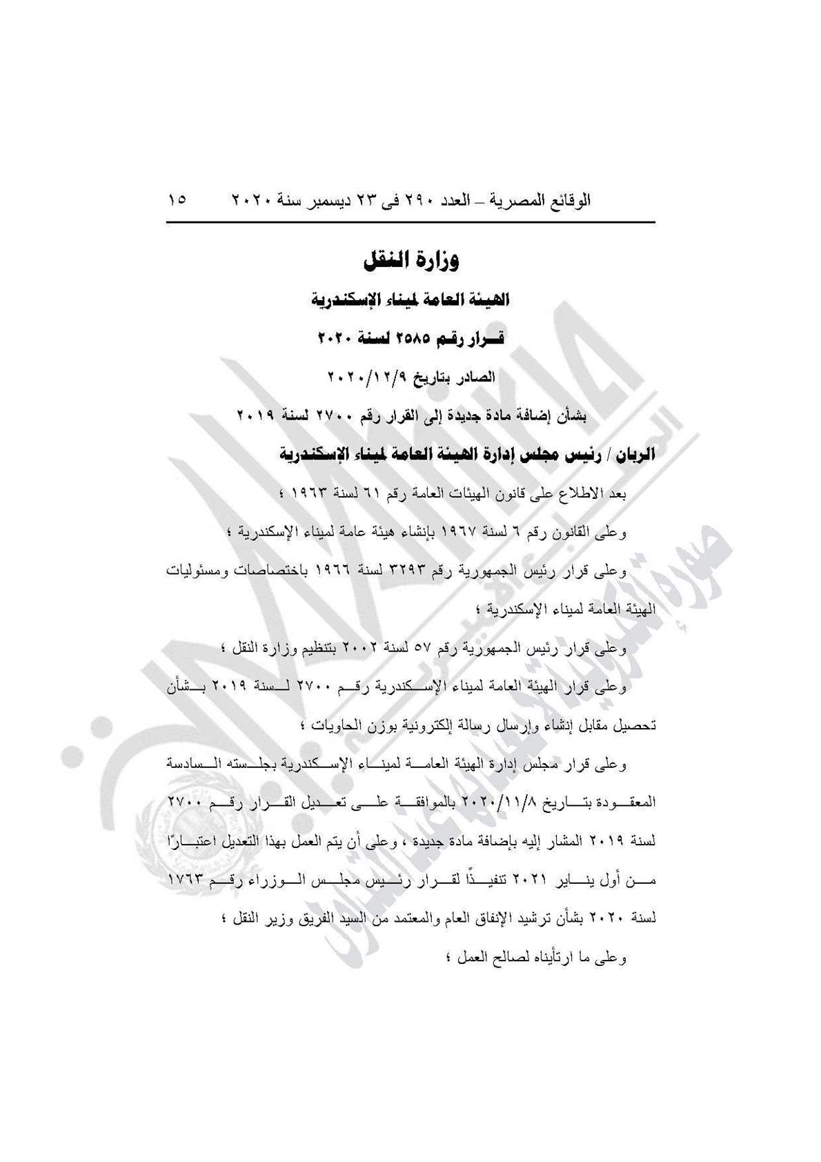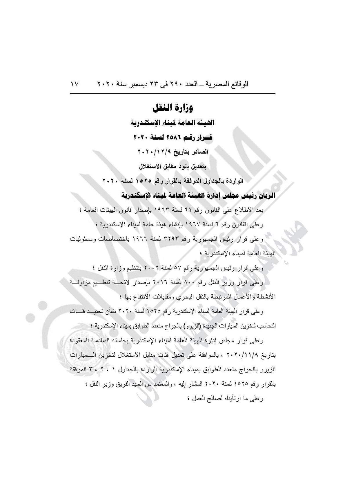 نشرت جريدة الوقائع المصرية في عددها رقم 290، الصادر في 23 ديسمبر 2020، قرارا وزارة النقل الهيئة العامة لميناء الإسكندرية، بشأن تخصيص نسبة 20% من حصيلة تطبيق القرار لإثابة العاملين بالهيئة، وتعديل بنود مقابل الاستغلال الواردة بالجداول المرفقة بالقرار رقم 1525 لسنة 2020.