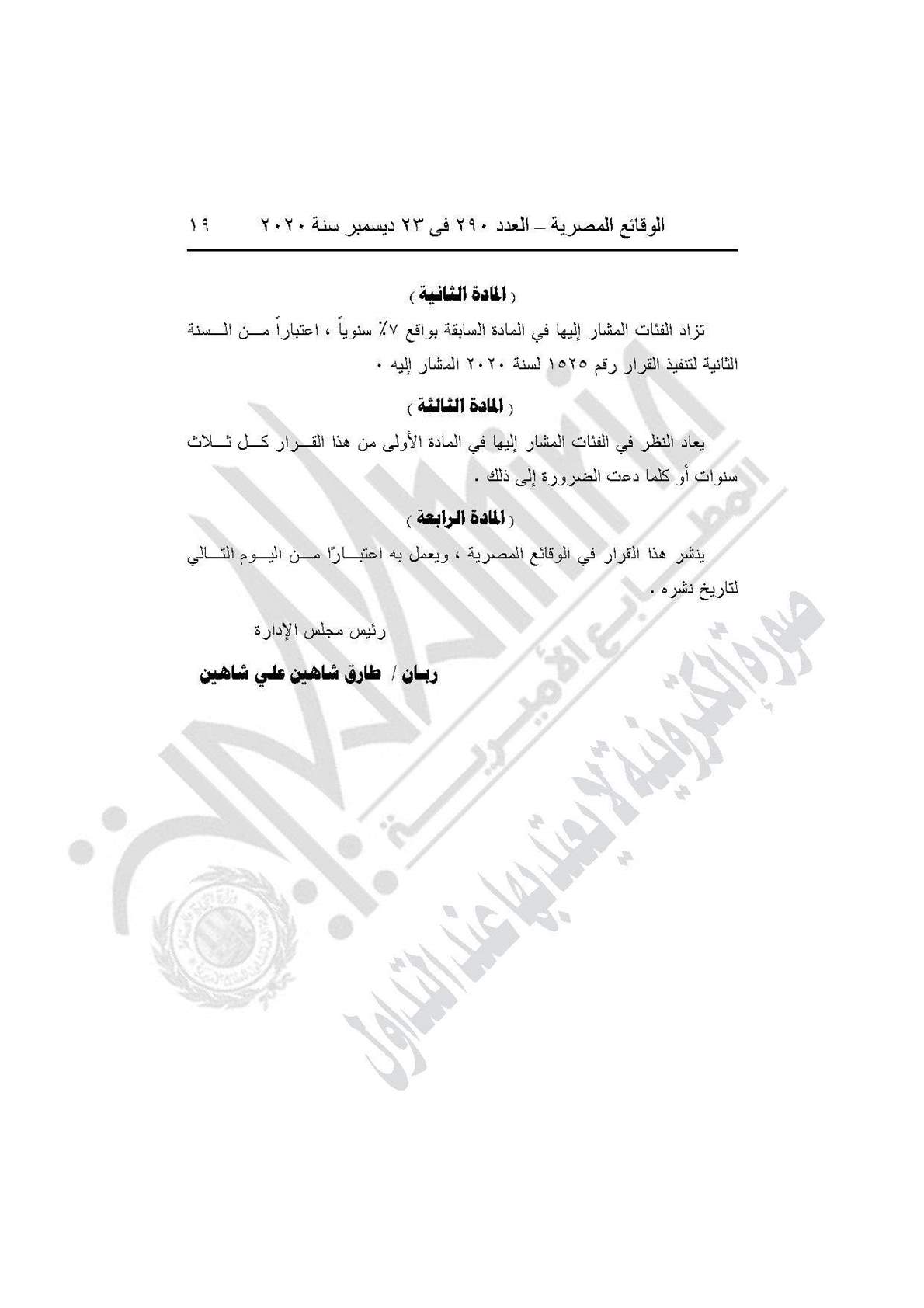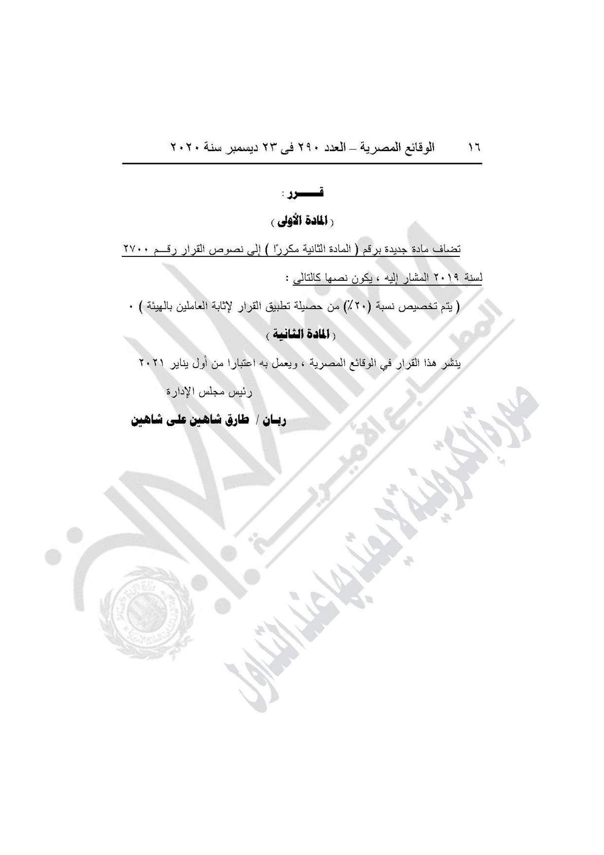 القرار رقم 2585 لسنة 2020، بشأن إضافة مادة جديدة إلى القرار رقم 2700 لسنة 2019، تضاف مادة برقم (المادة الثانية مكررًا" وتنص على أن "يتم تخصيص نسبة 20% من حصيلة تطبيق القرار لإثابة العاملين بالهيئة"