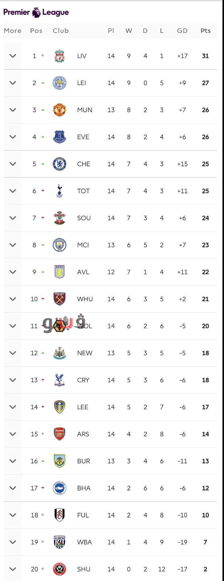 يتصدر ليفربول ترتيب الدوري الإنجليزي الممتاز، برصيد 31 نقطة، متقدمًا بفارق 4 نقاط على وصيفه ليستر سيتي بعد مرور 14 جولة حتى الآن.