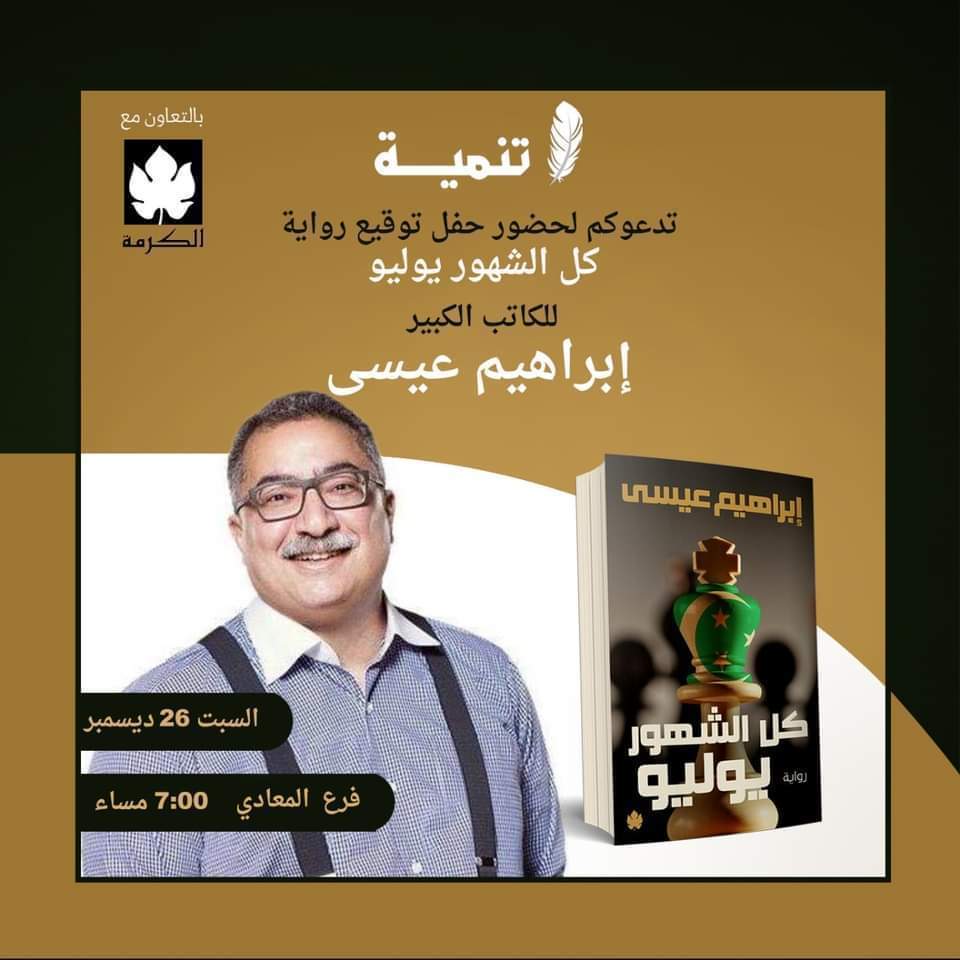 تعقد مكتبة تنمية في فرعها بالمعادي، حفل توقيع ومناقشة لرواية "كل الشهور يوليو" للكاتب إبراهيم عيسى، وذلك في تمام السابعة من مساء السبت المقبل الموافق 26 ديسمبر الجاري.