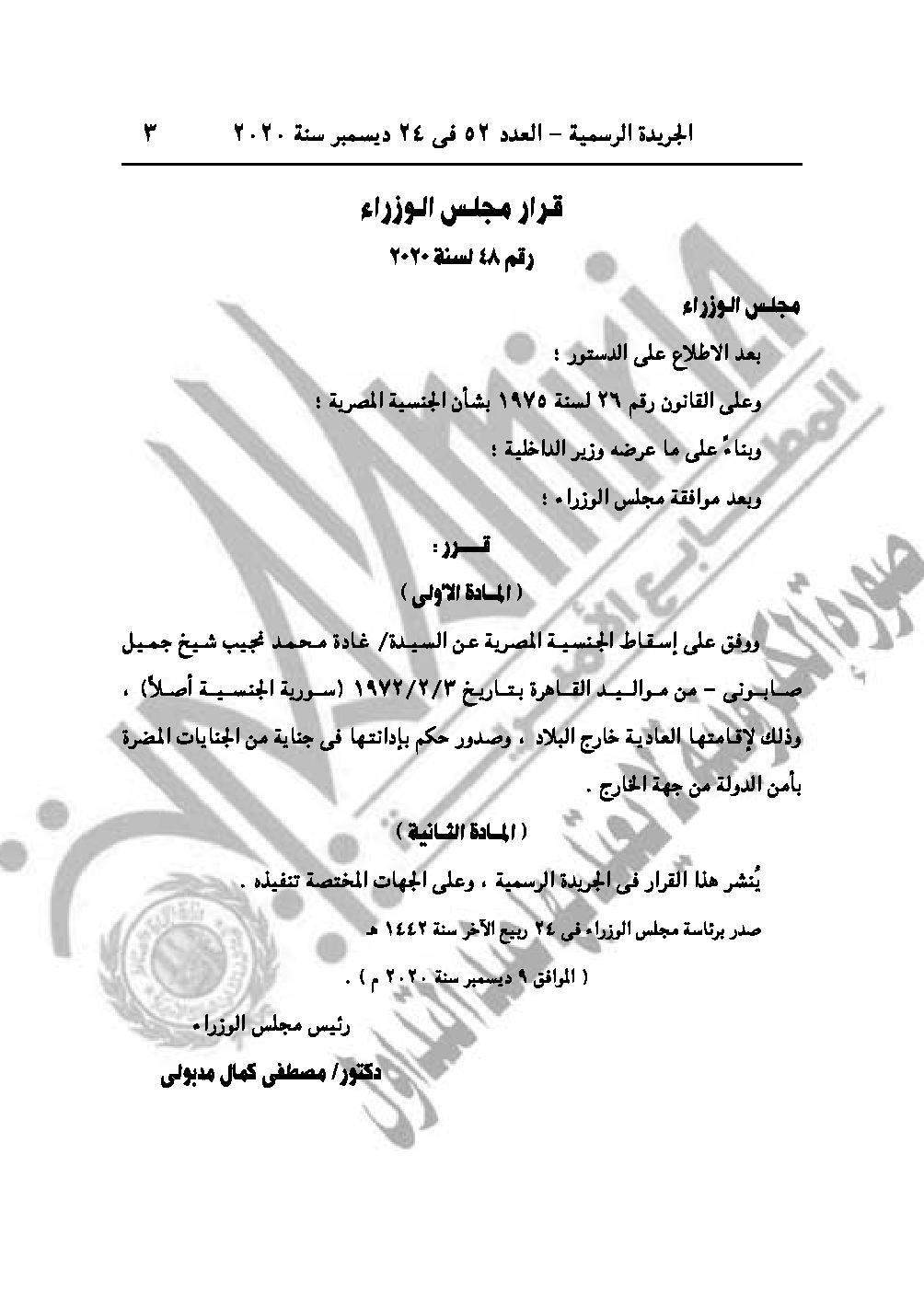 وينص القرار على الموافقة على إسقاط الجنسية المصرية عن غادة محمد نجيب شيخ جميل صابوني، مواليد القاهرة 1972 سورية الجنسية، وذلك لإقامتها العادية خارج البلاد، وصدور حكم بإدانتها في جناية من الجنايات المضرة بأمن الدولة من جهة الخارج.