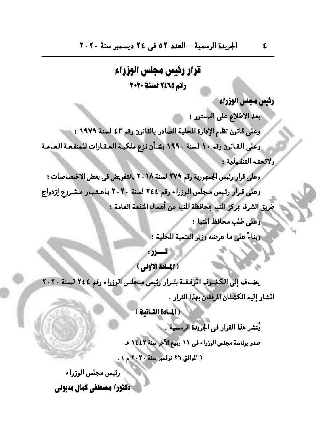 القرار رقم 2465 لسنة 2020، بإضافة كشفين إلى الكشوف المرفقة بقرار رئيس مجلس الوزراء رقم 244 لسنة 2020.