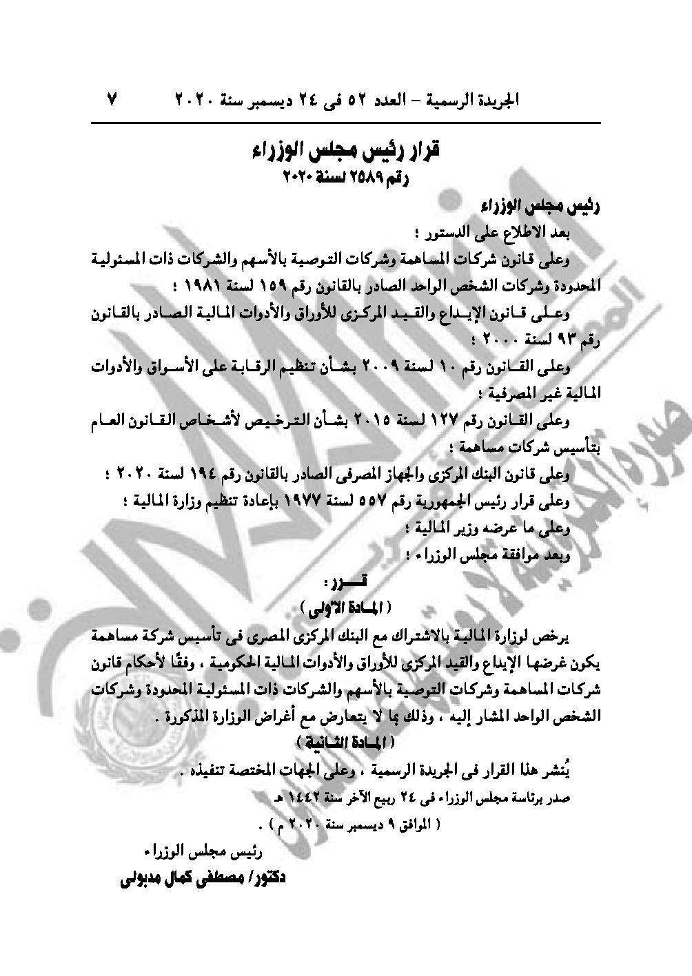 والقرار رقم 2589 لسنة 2020 بالترخيص لوزارة المالية بالاشتراك مع البنك المركزي المصري في تأسيس شركة مساهمة يكون غرضها الإيداع والقيد المركزى للأوراق والأدوات المالية الحكومية.