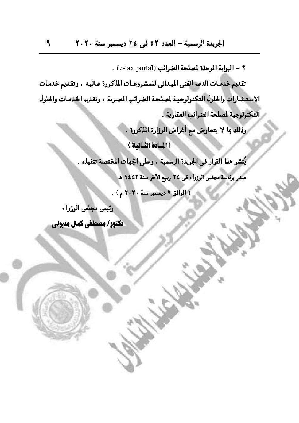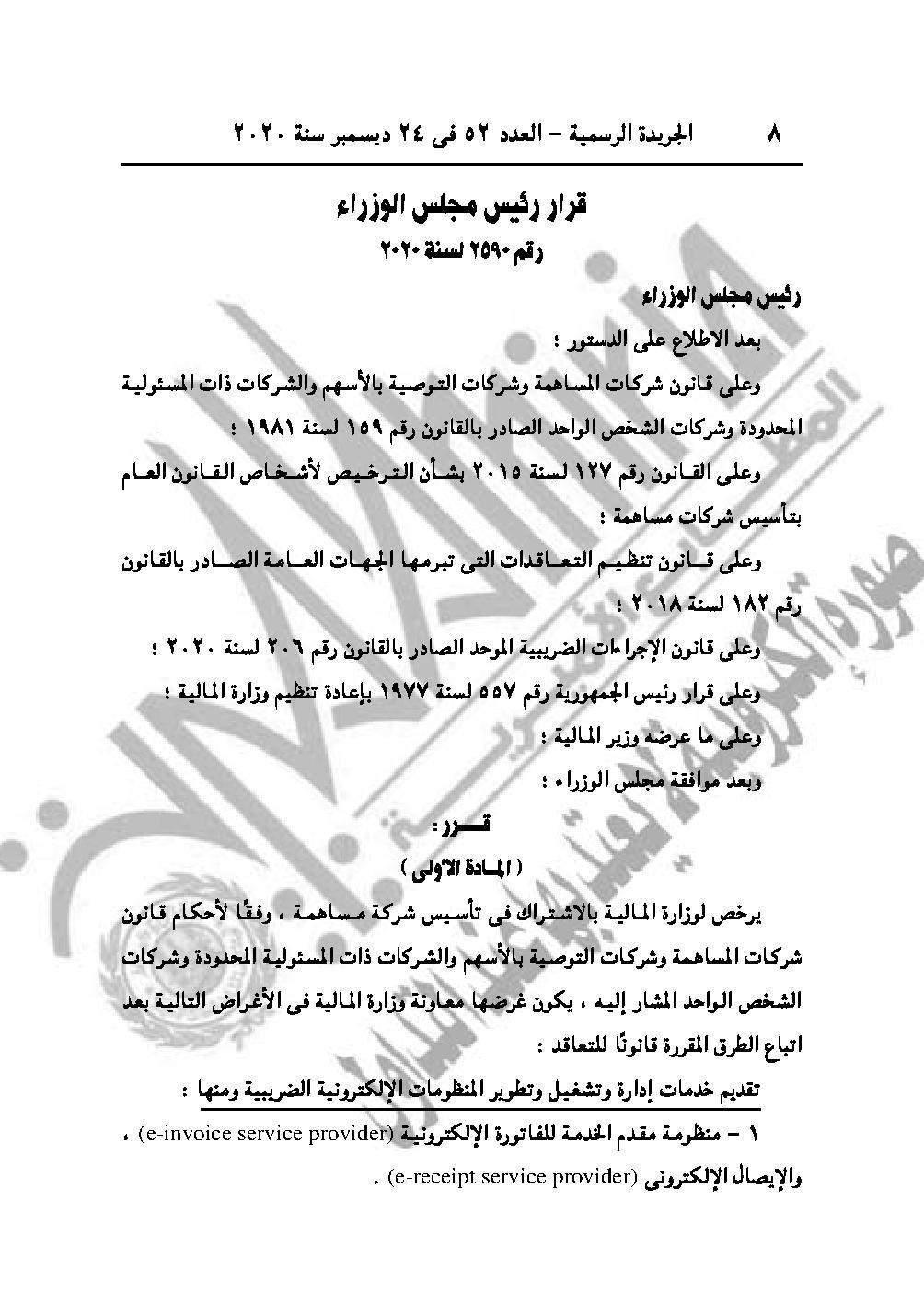والقرار رقم 2590 لسنة 2020 بالترخيص لوزارة المالية بالاشتراك في تأسيس شركة مساهمة.