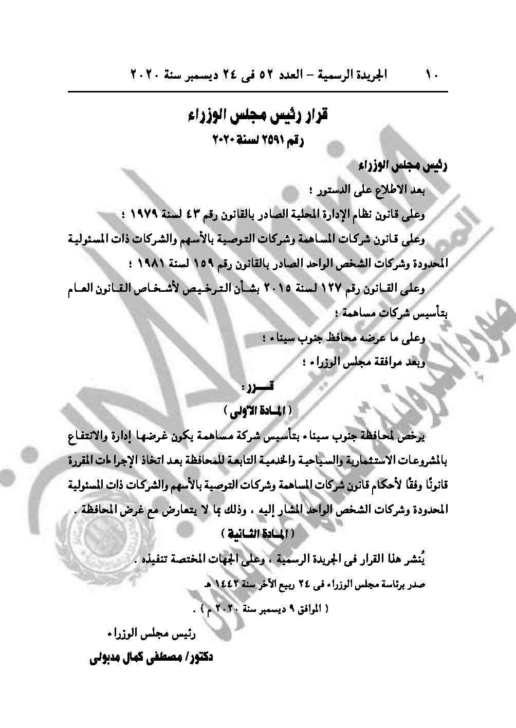 نشرت الجريدة الرسمية في عددها رقم 52، الصادر في 24 ديسمبر 2020، 4 قرارات لرئيس مجلس الوزراء الدكتور مصطفى مدبولي، بشأن بالترخيص لوزارة المالية بالاشتراك مع البنك المركزي المصري في تأسيس شركة مساهمة، والترخيص لمحافظة جنوب سيناء بتأسيس شركة مساهمة.