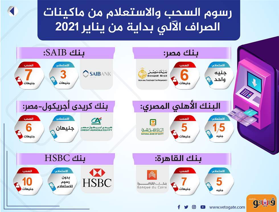 رسوم السحب والاستعلام من ماكينات الصراف الآلي بداية من يناير 2021 | إنفوجراف الخميس 24/ديسمبر/2020 - 02:16 م 12/24/2020 2:16:42 PM رسوم السحب والاستعلام من ماكينات الصراف الآلي شارك طباعة 18 حجم الخط شارك طباعة رسوم السحب ماكينات الصراف الآلي بنوك رسوم الايداع رسوم السحب من البنوك
