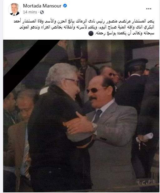 نعى المستشار مرتضى منصور رئيس نادي الزمالك السابق، المستشار أحمد البكري، رئيس نادي الزمالك الحالي، الذى وافته المنية صباح اليوم الخميس، وقدم العزاء لأسرته وأشقائه.