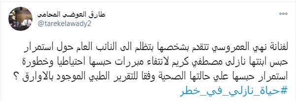 وكتب طارق العوضي تغريدة على تويتر: "الفنانة نهي العمروسي تتقدم بشخصها بتظلم إلى النائب العام حول استمرار حبس ابنتها نازلى مصطفي كريم لانتفاء مبررات حبسها احتياطيا وخطورة استمرار حبسها علي حالتها الصحية وفقا للتقرير الطبي الموجود بالأوارق #حياة_نازلي_في_خطر".