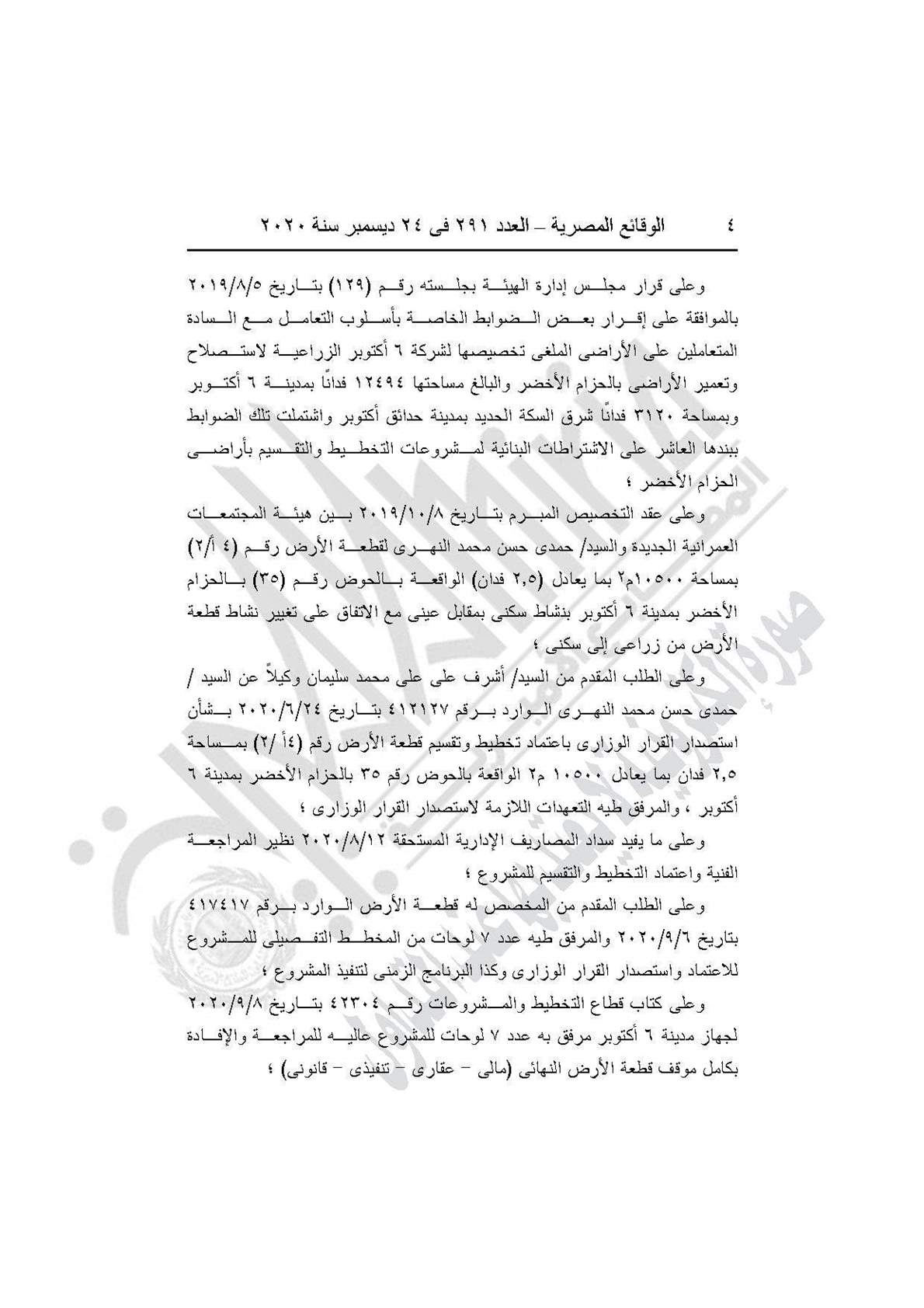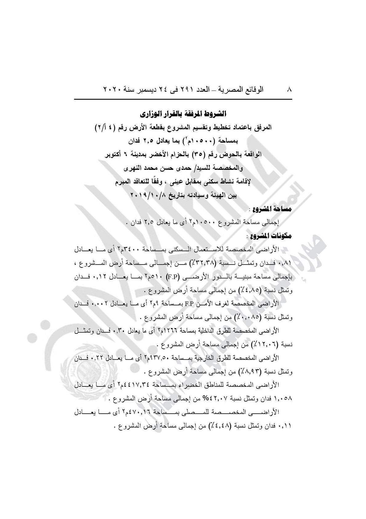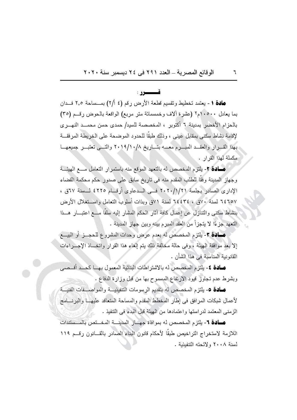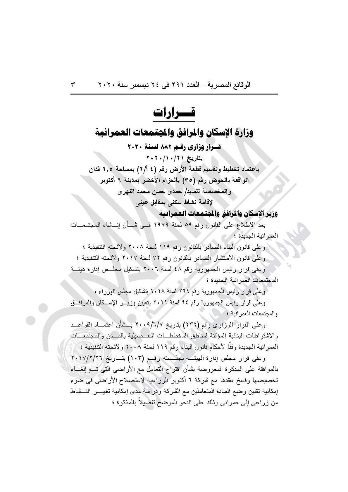 نشرت جريدة الوقائع المصرية في عددها رقم 291، الصادر في 24 ديسمبر 2020، قرار وزارة الإسكان والمرافق والمجتمعات العمرانية رقم 882 لسنة 2020، باعتماد تخطيط وتقسيم قطعة أرض بمساحة 2.5 فدان الواقعة بالحوض رقم (35) بالحزام الأخضر بمدينة 6 أكتوبر لإقامة نشاط سكنى بمقابل عينى.