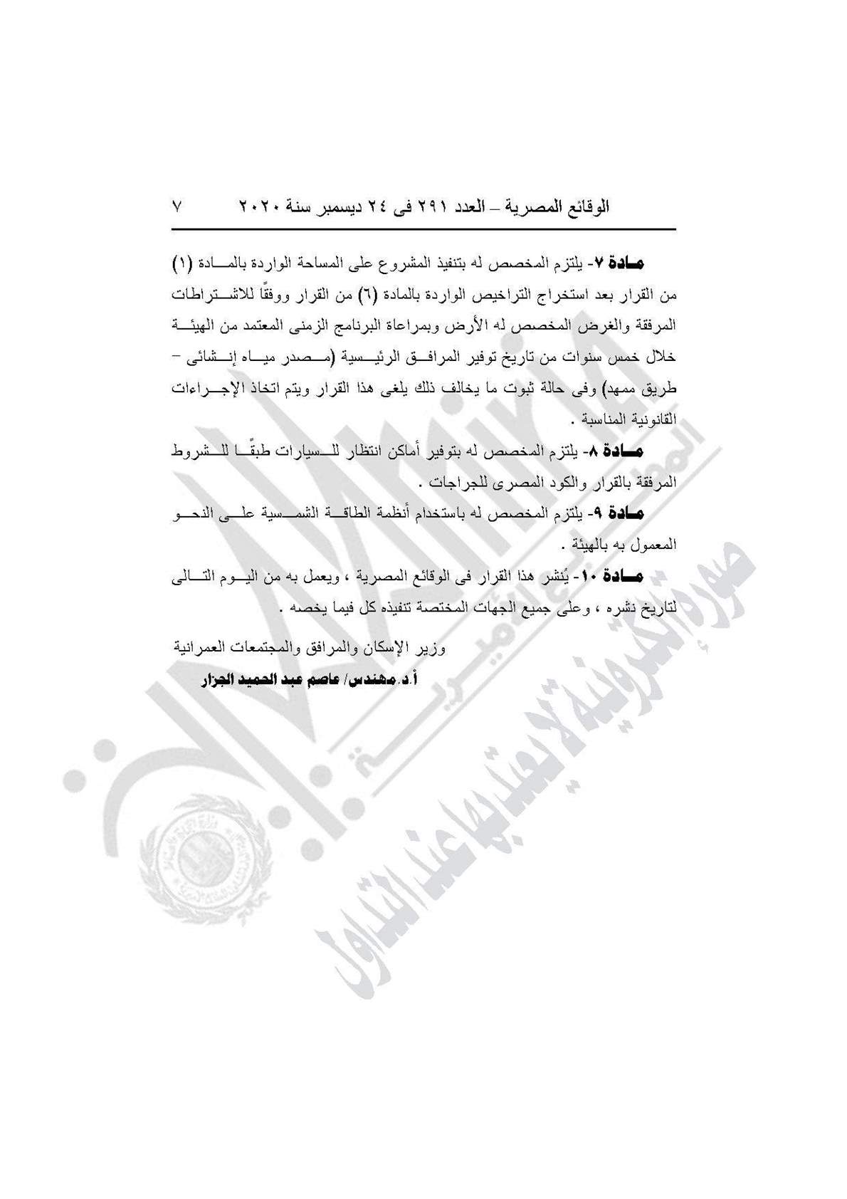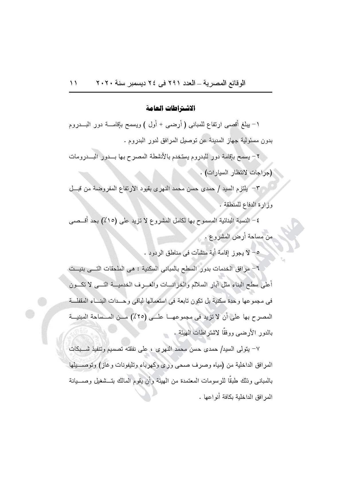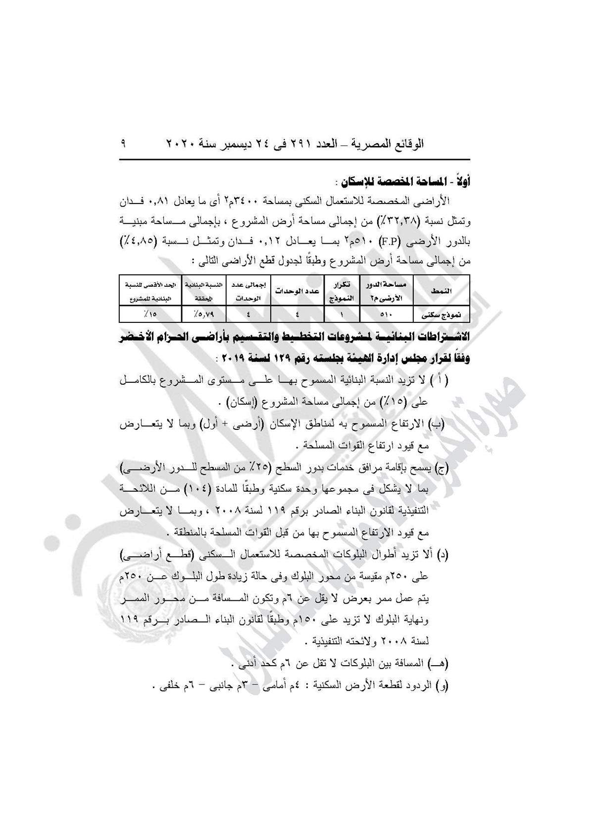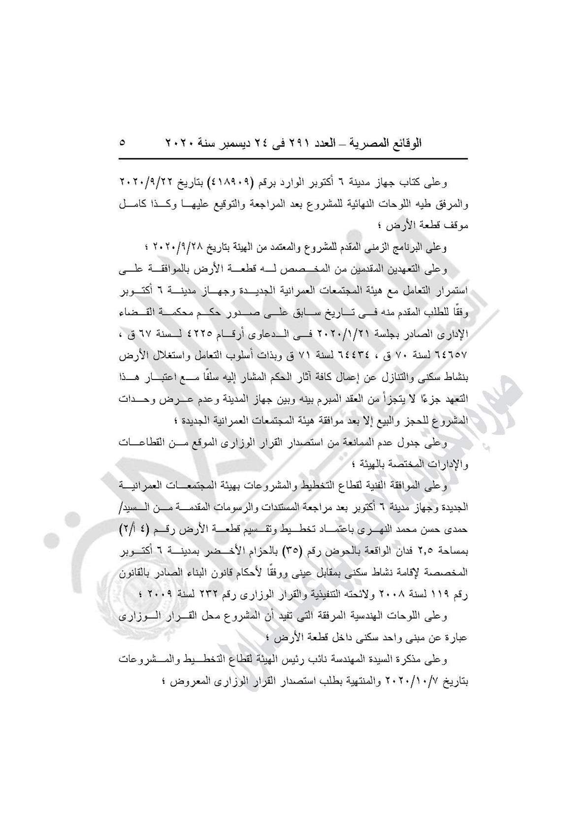 نشرت جريدة الوقائع المصرية في عددها رقم 291، الصادر في 24 ديسمبر 2020، قرار وزارة الإسكان والمرافق والمجتمعات العمرانية رقم 882 لسنة 2020، باعتماد تخطيط وتقسيم قطعة أرض بمساحة 2.5 فدان الواقعة بالحوض رقم (35) بالحزام الأخضر بمدينة 6 أكتوبر لإقامة نشاط سكنى بمقابل عينى.