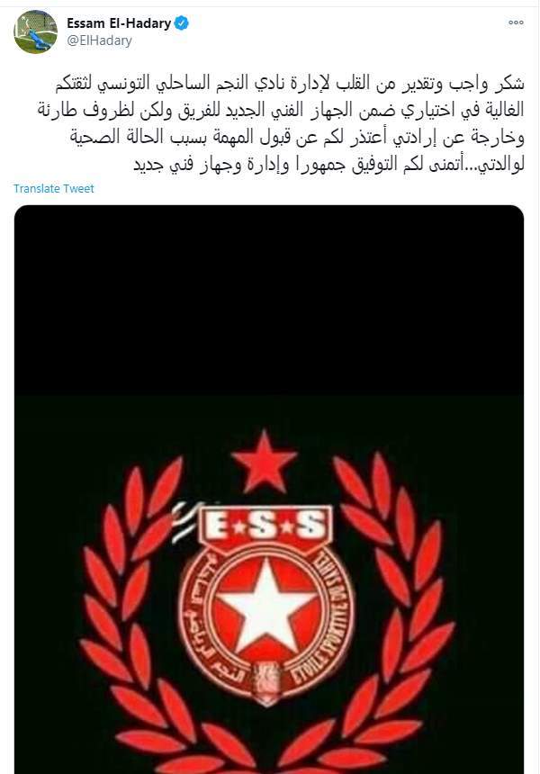 وكتب عصام الحضري تغريدة على تويتر "شكر واجب وتقدير من القلب لإدارة نادي النجم الساحلي التونسي لثقتكم الغالية في اختياري ضمن الجهاز الفني الجديد للفريق ولكن لظروف طارئة وخارجة عن إرادتي أعتذر لكم عن قبول المهمة بسبب الحالة الصحية لوالدتي...أتمنى لكم التوفيق جمهورا وإدارة وجهاز فني جديد"
