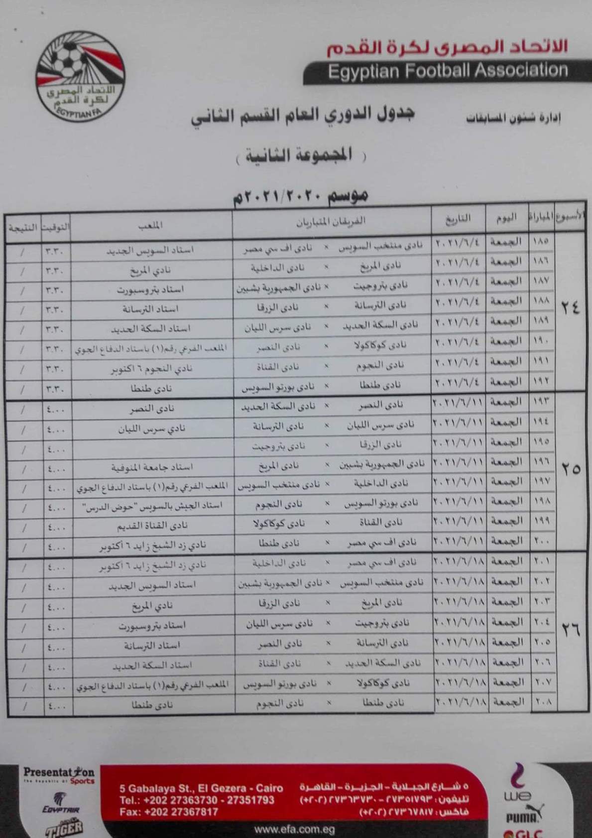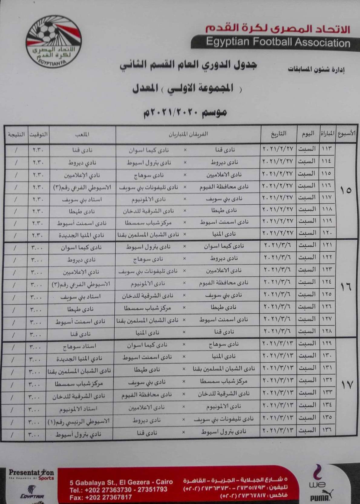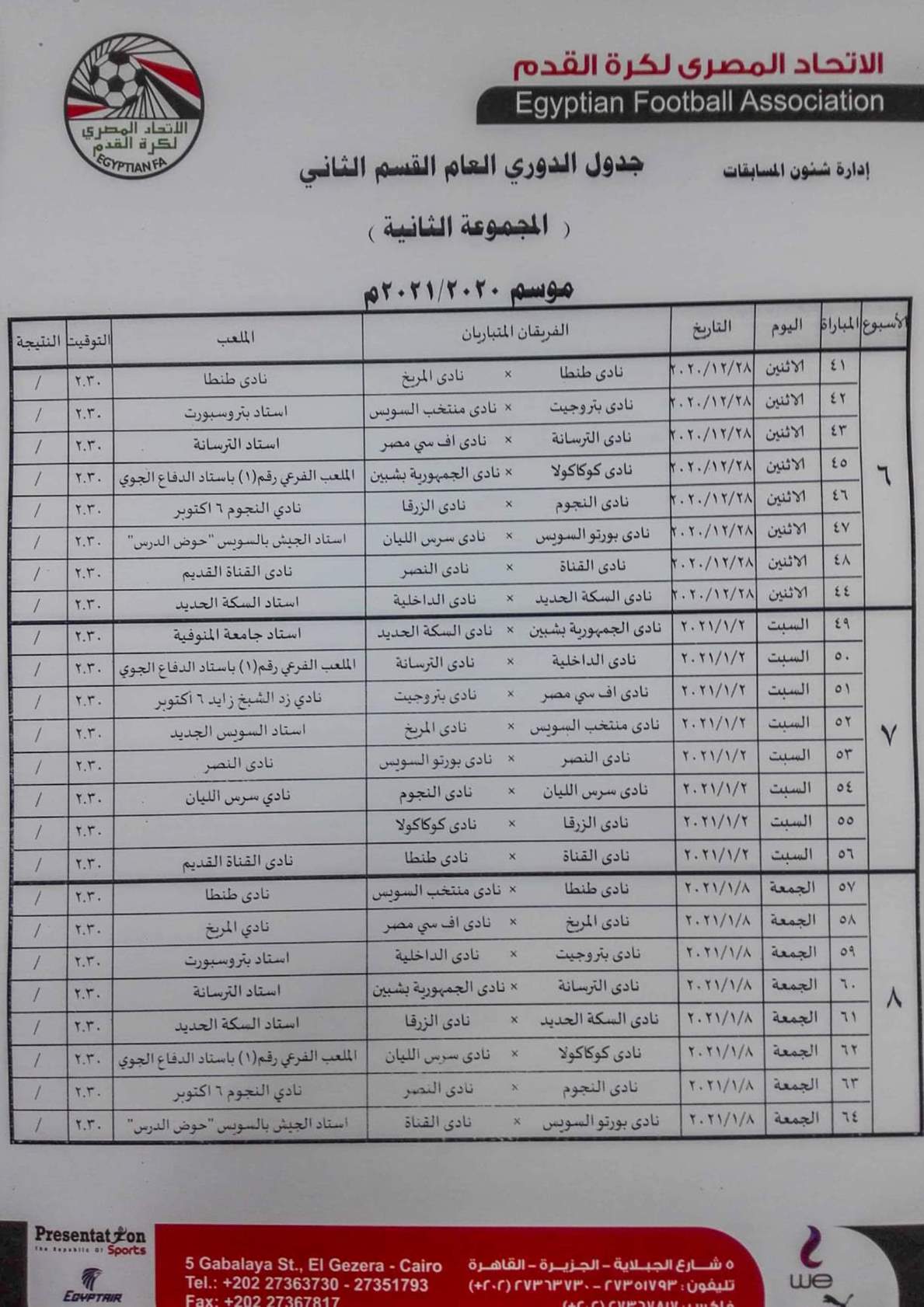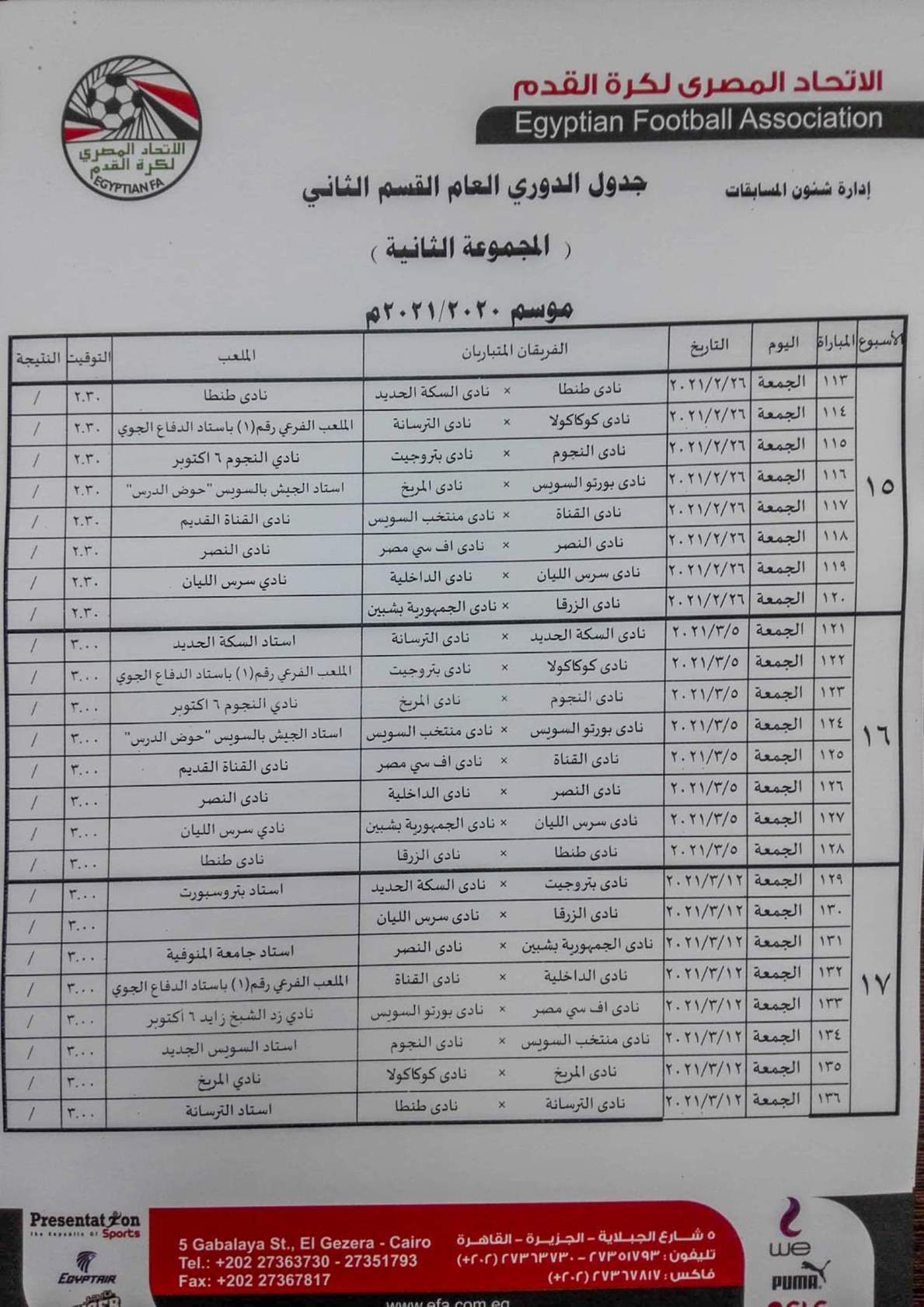 فيما جاءت مباريات المجموعة الثانية "القاهرة والقناة " كالتالي