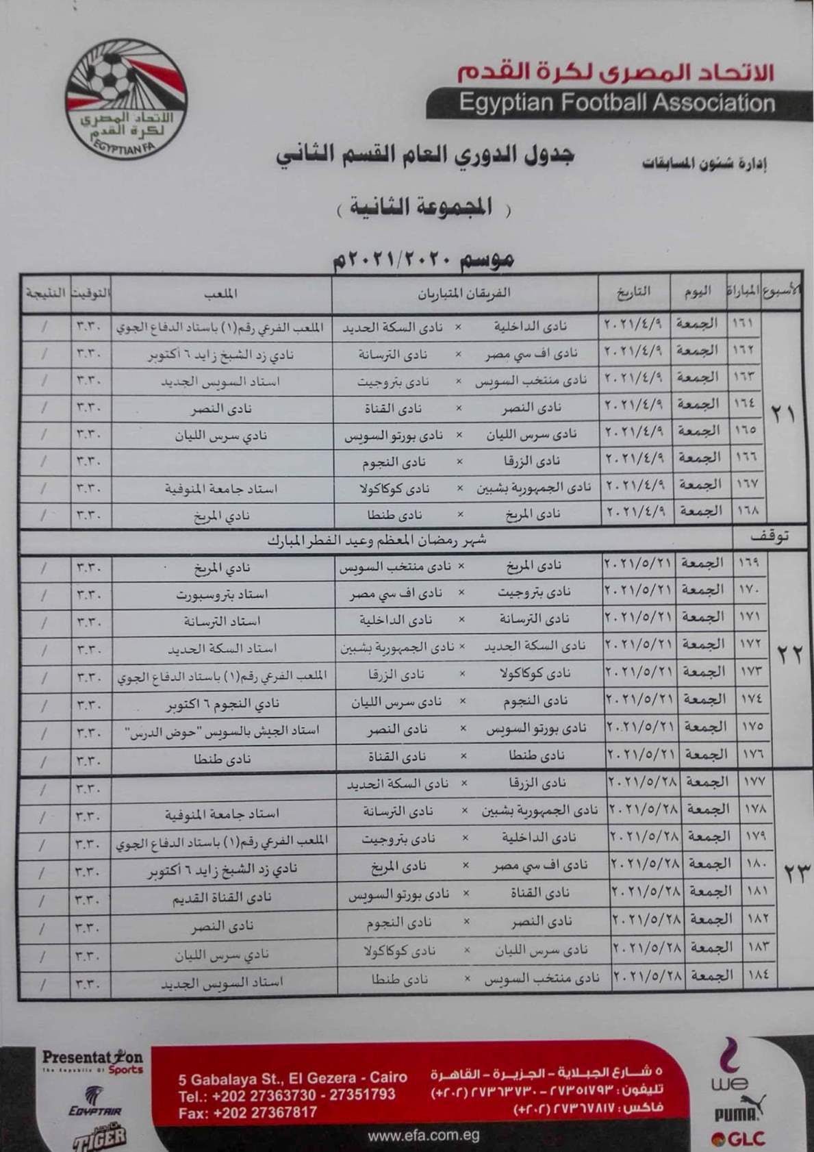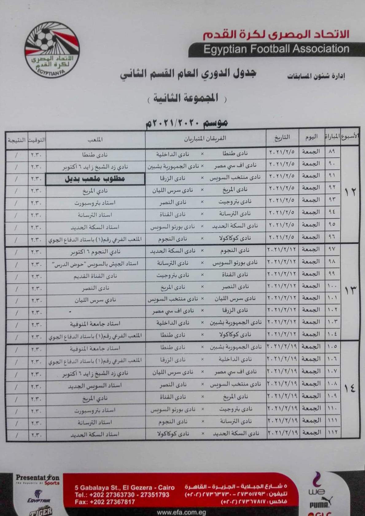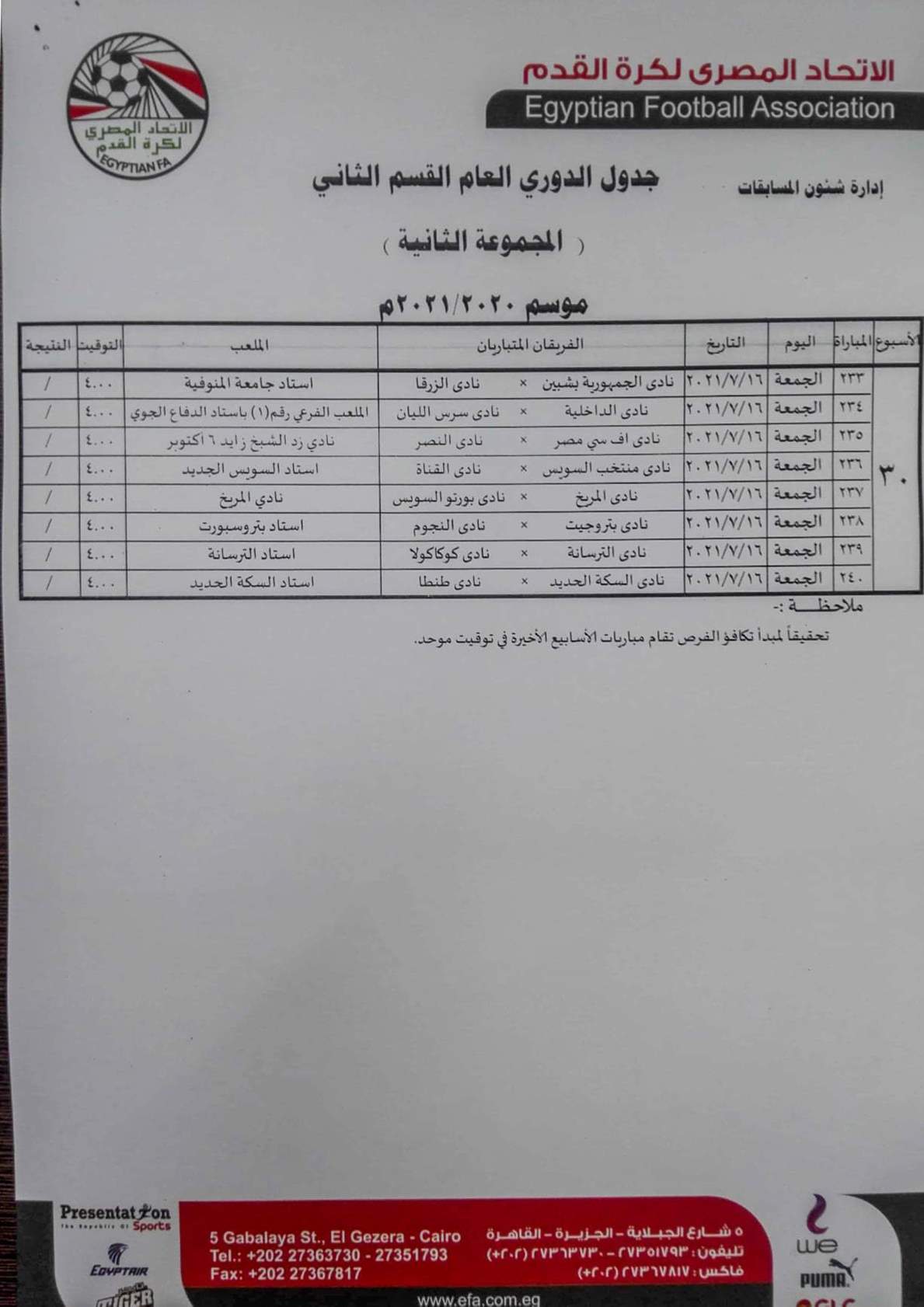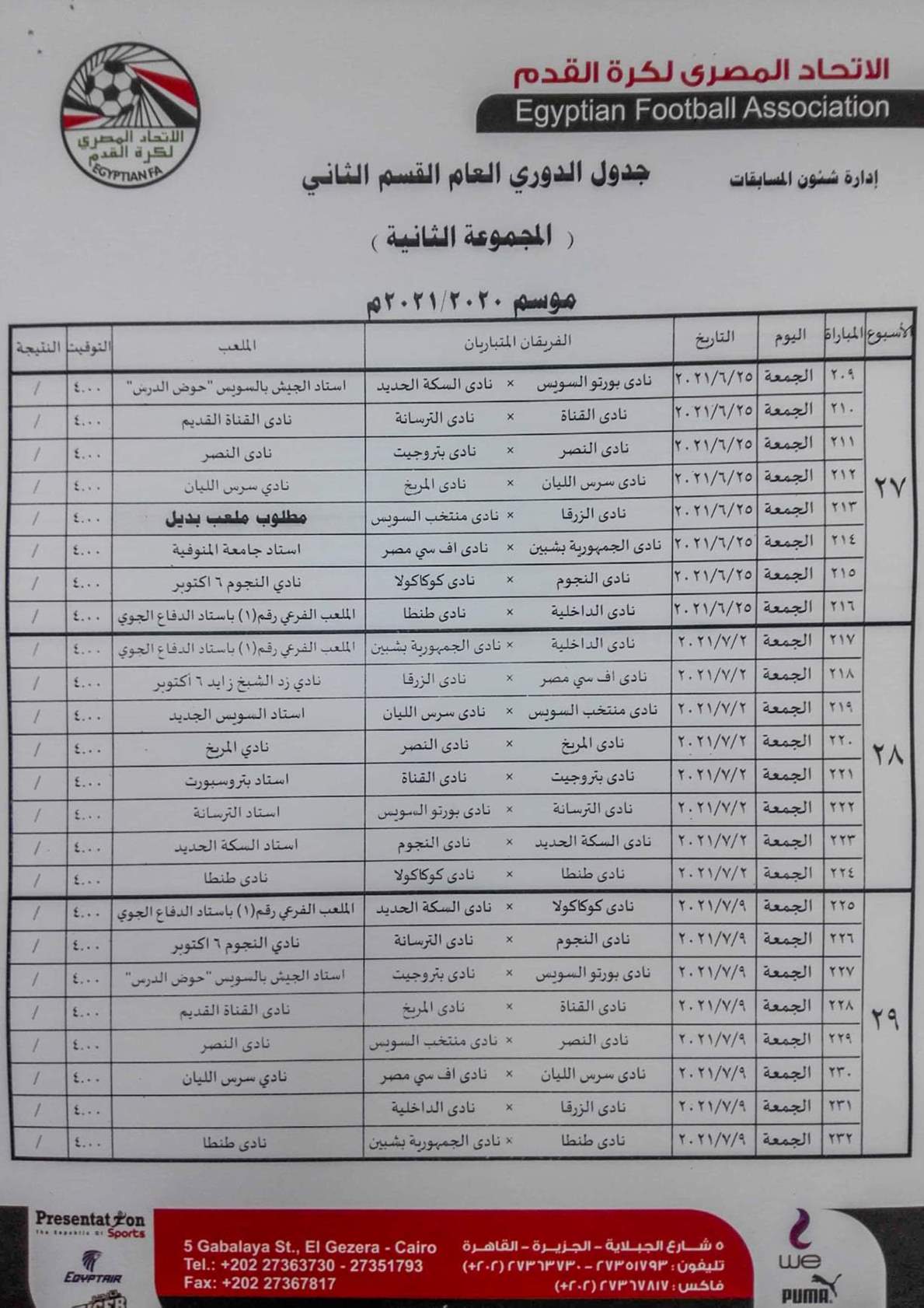 فيما جاءت مباريات المجموعة الثانية "القاهرة والقناة " كالتالي