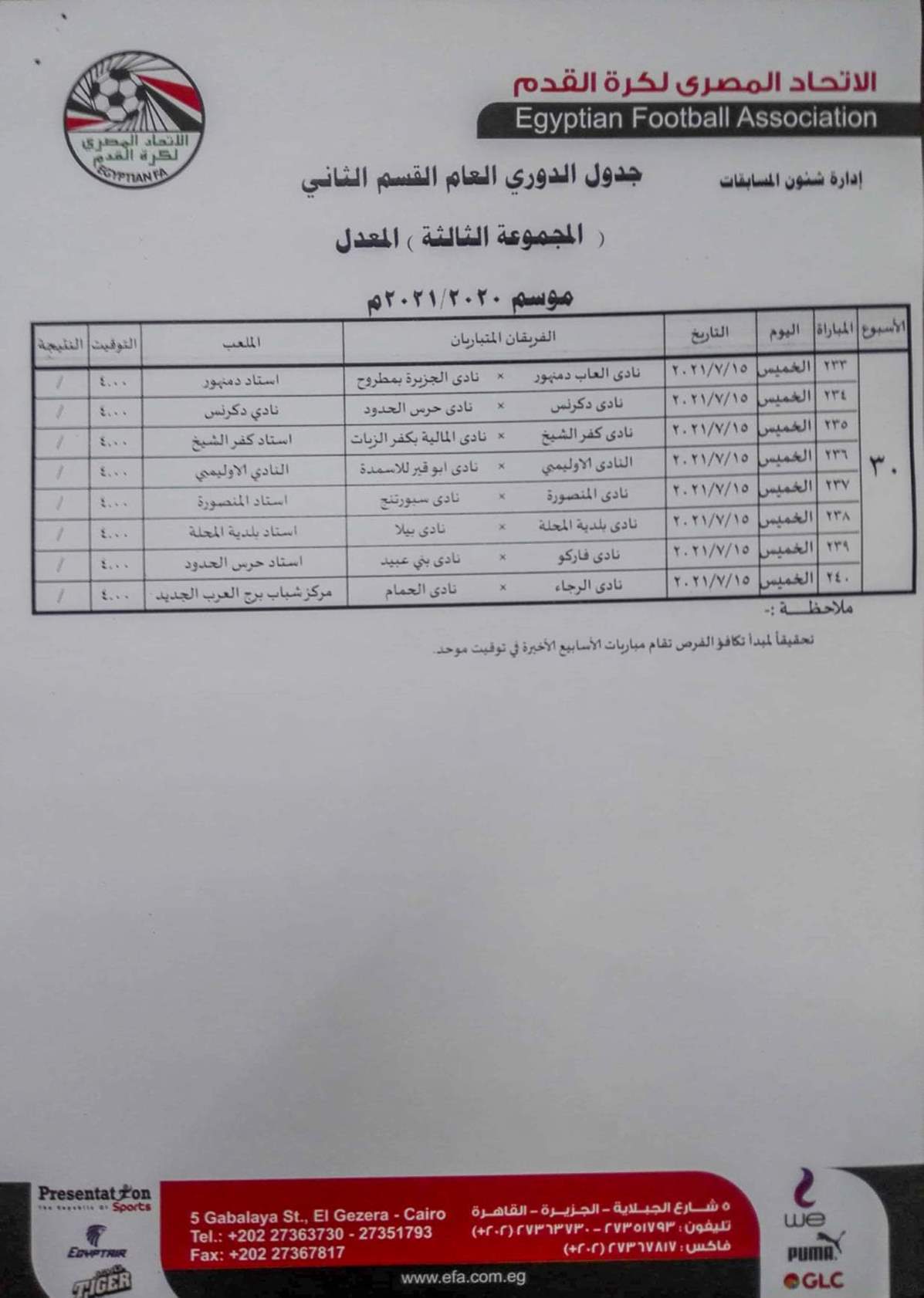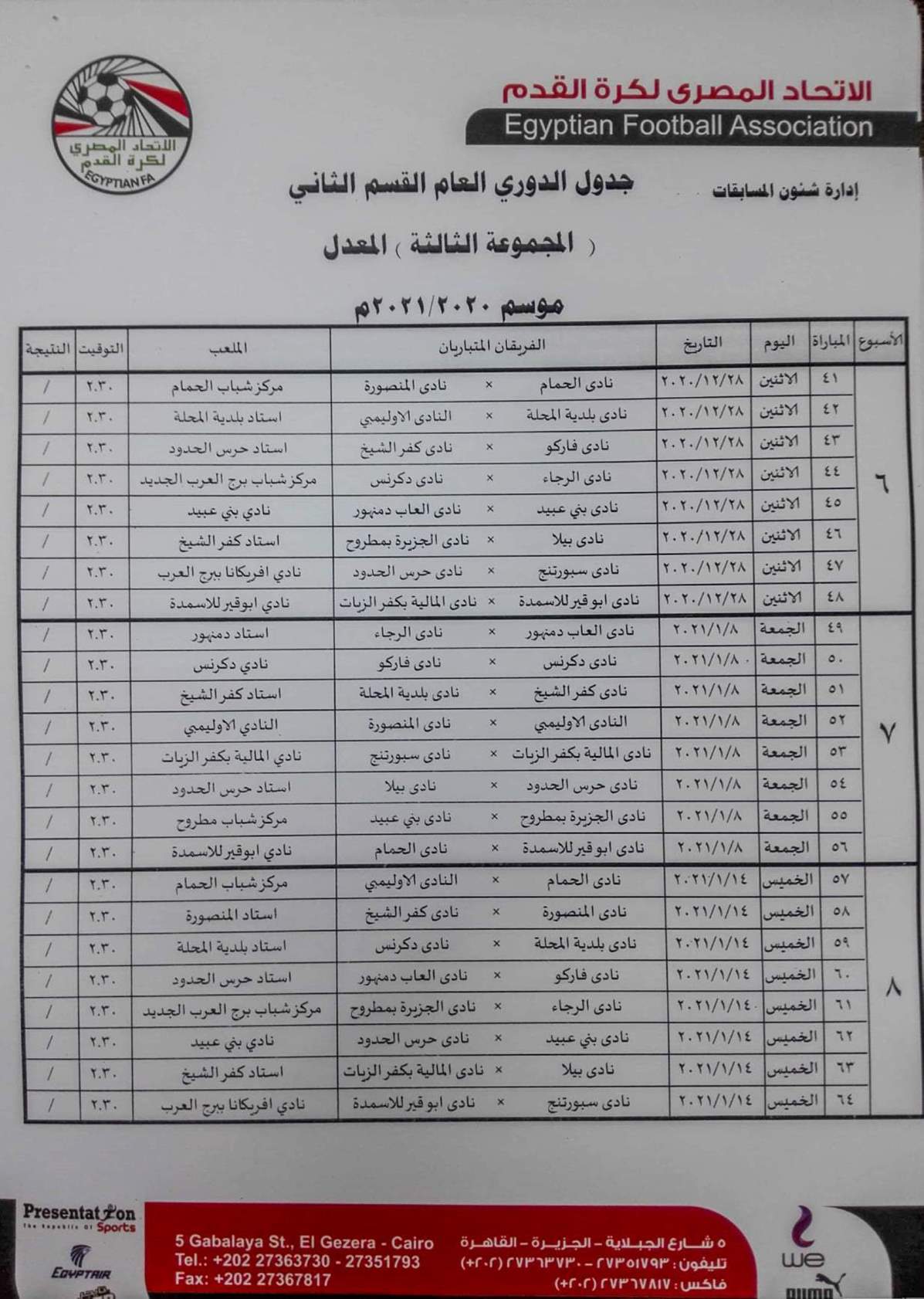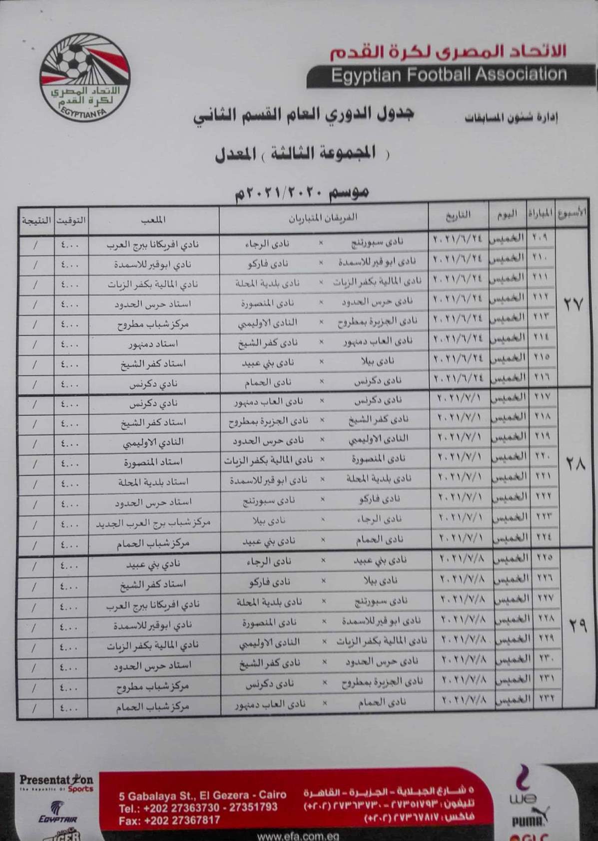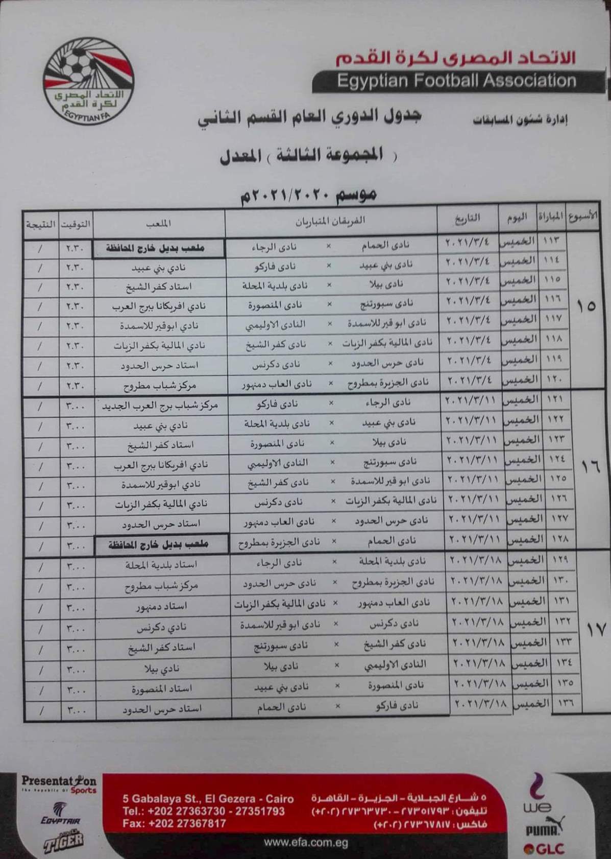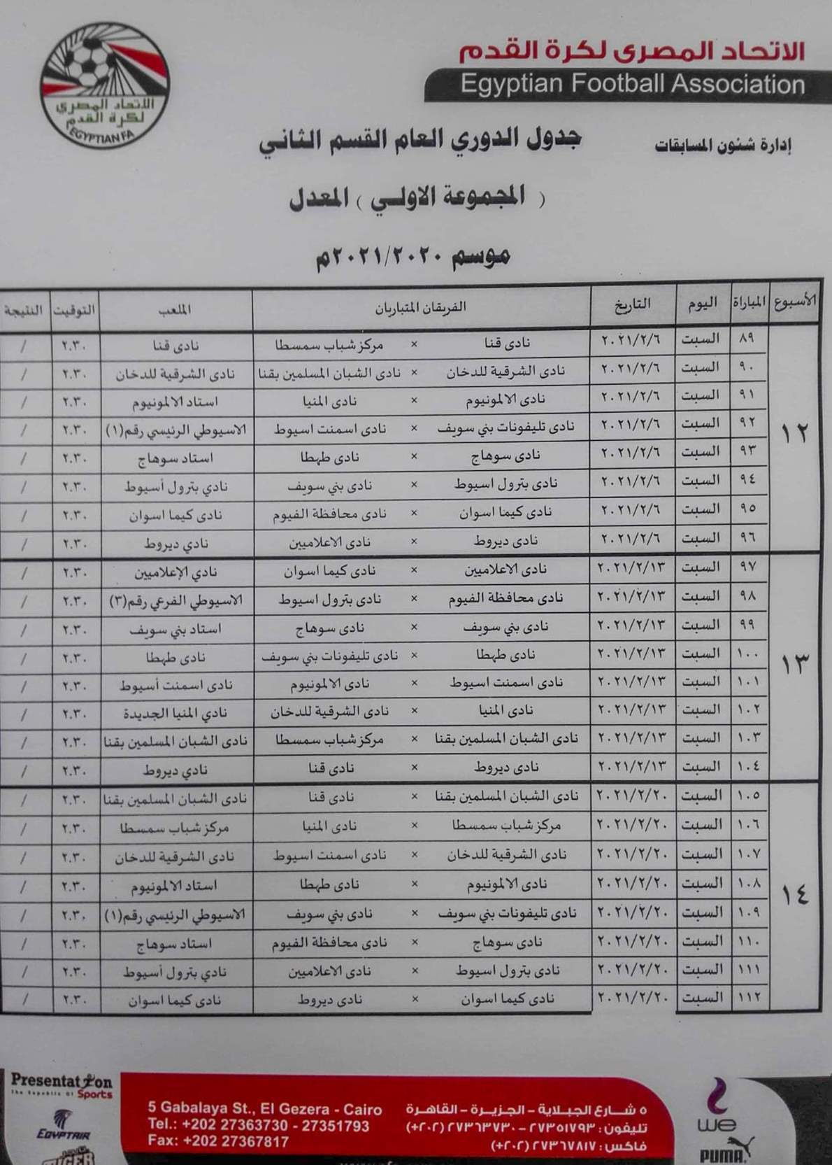 فيما جاءت مباريات المجموعة الثانية "القاهرة والقناة " كالتالي