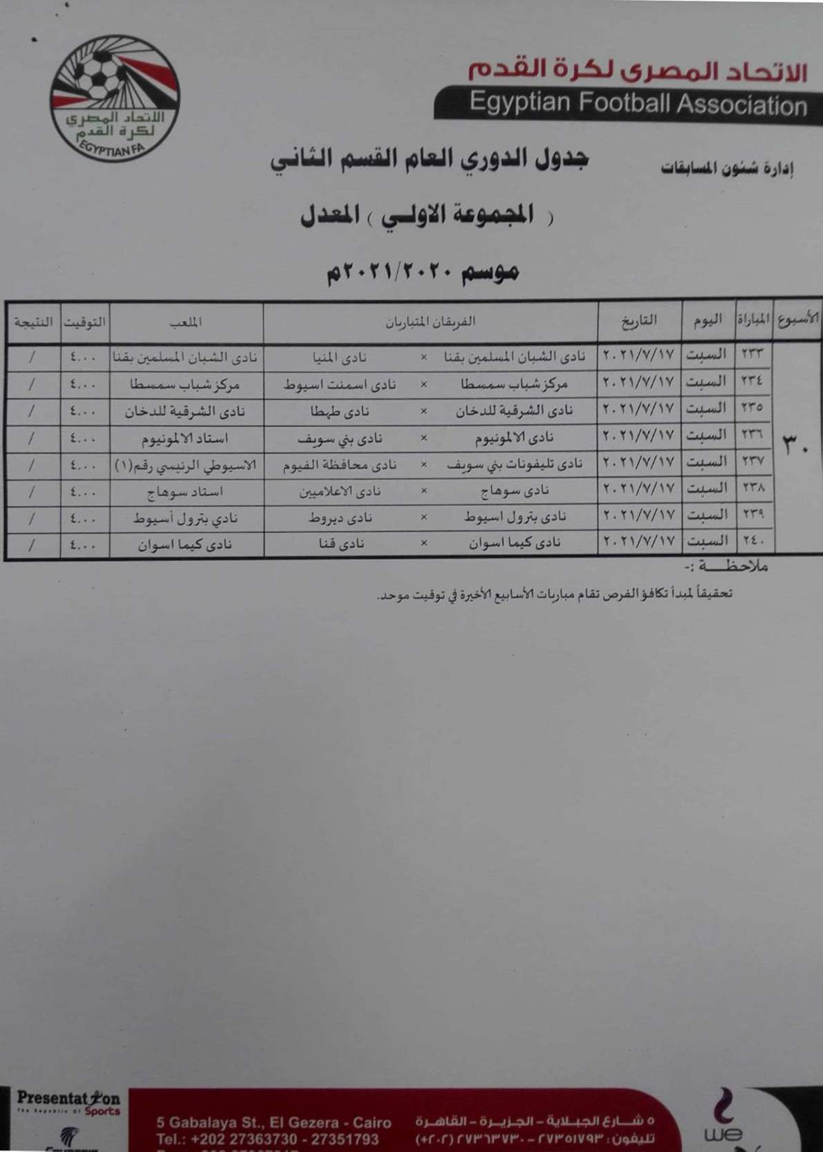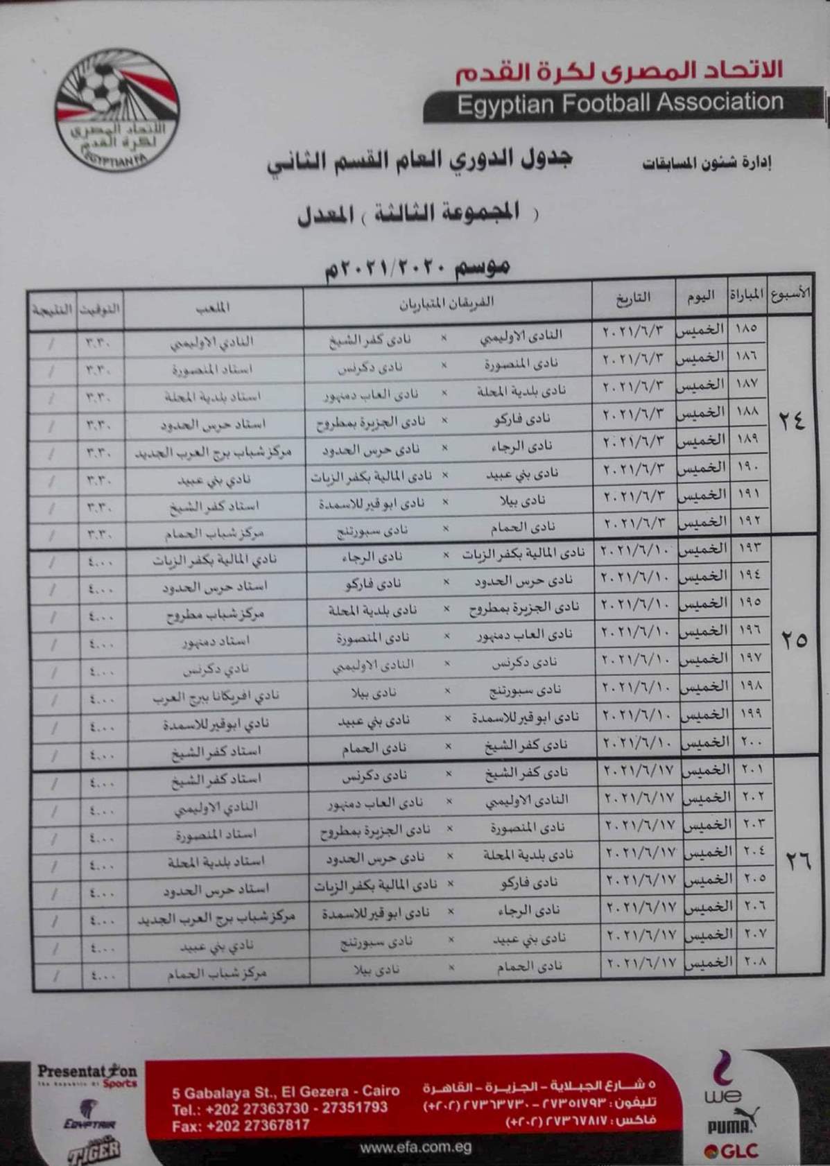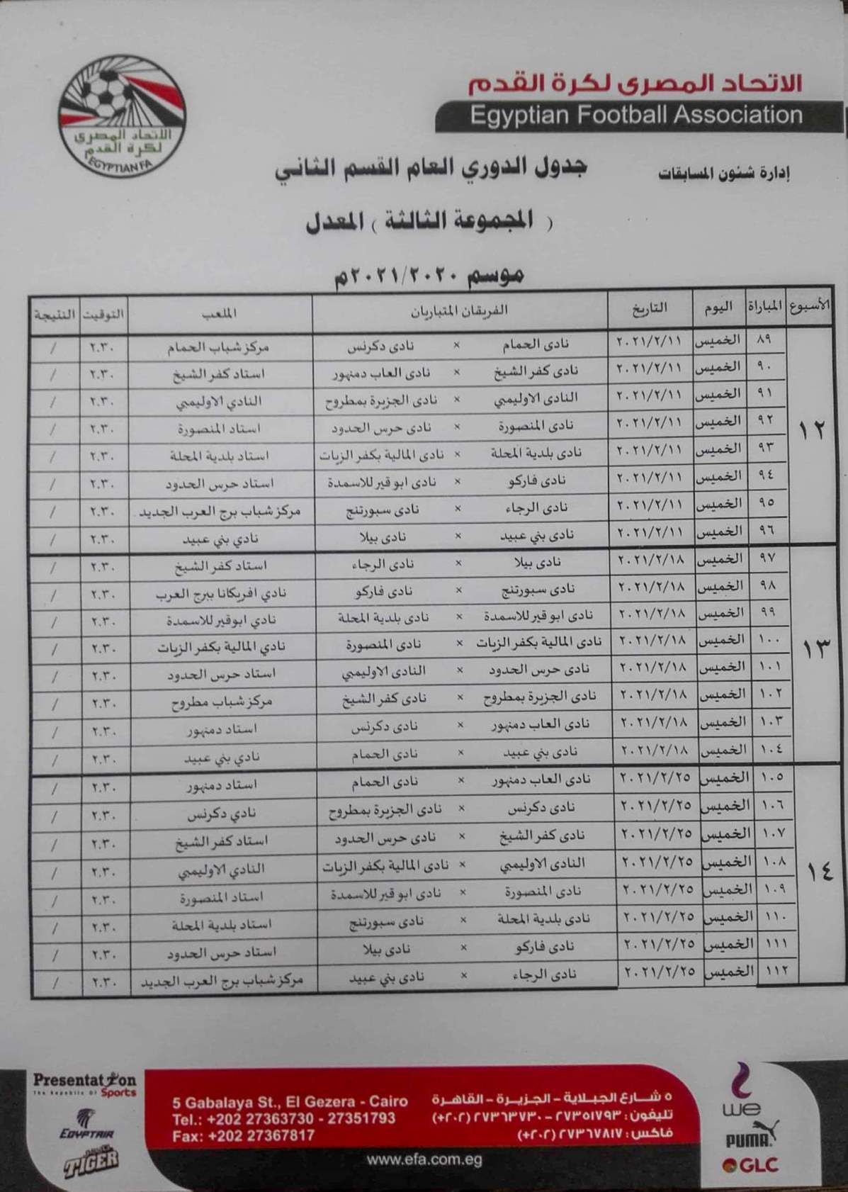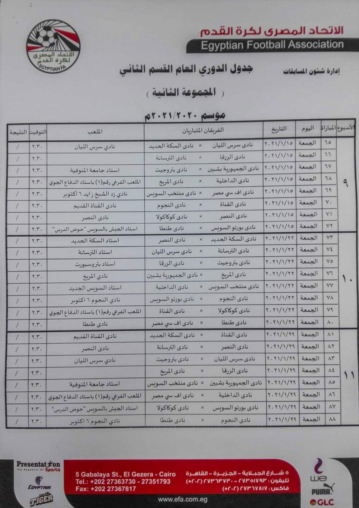 فيما جاءت مباريات المجموعة الثانية "القاهرة والقناة " كالتالي