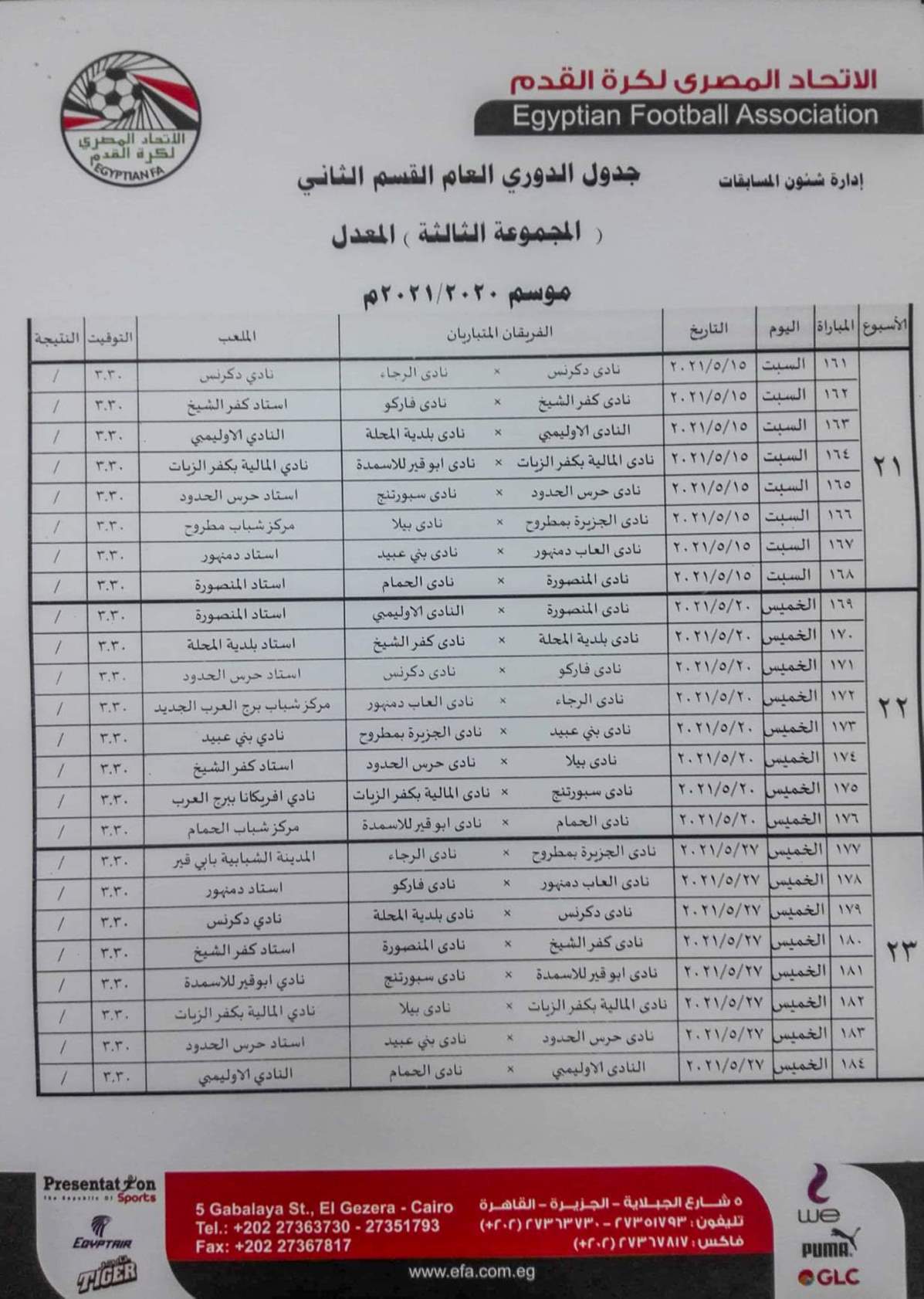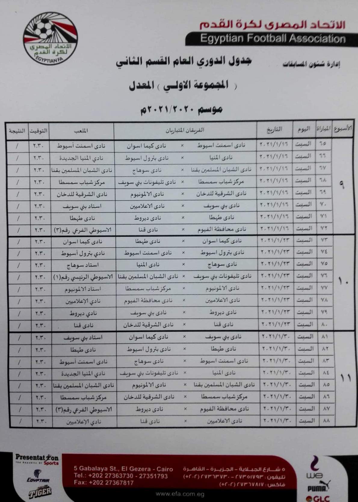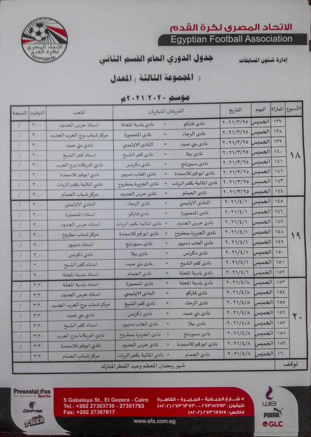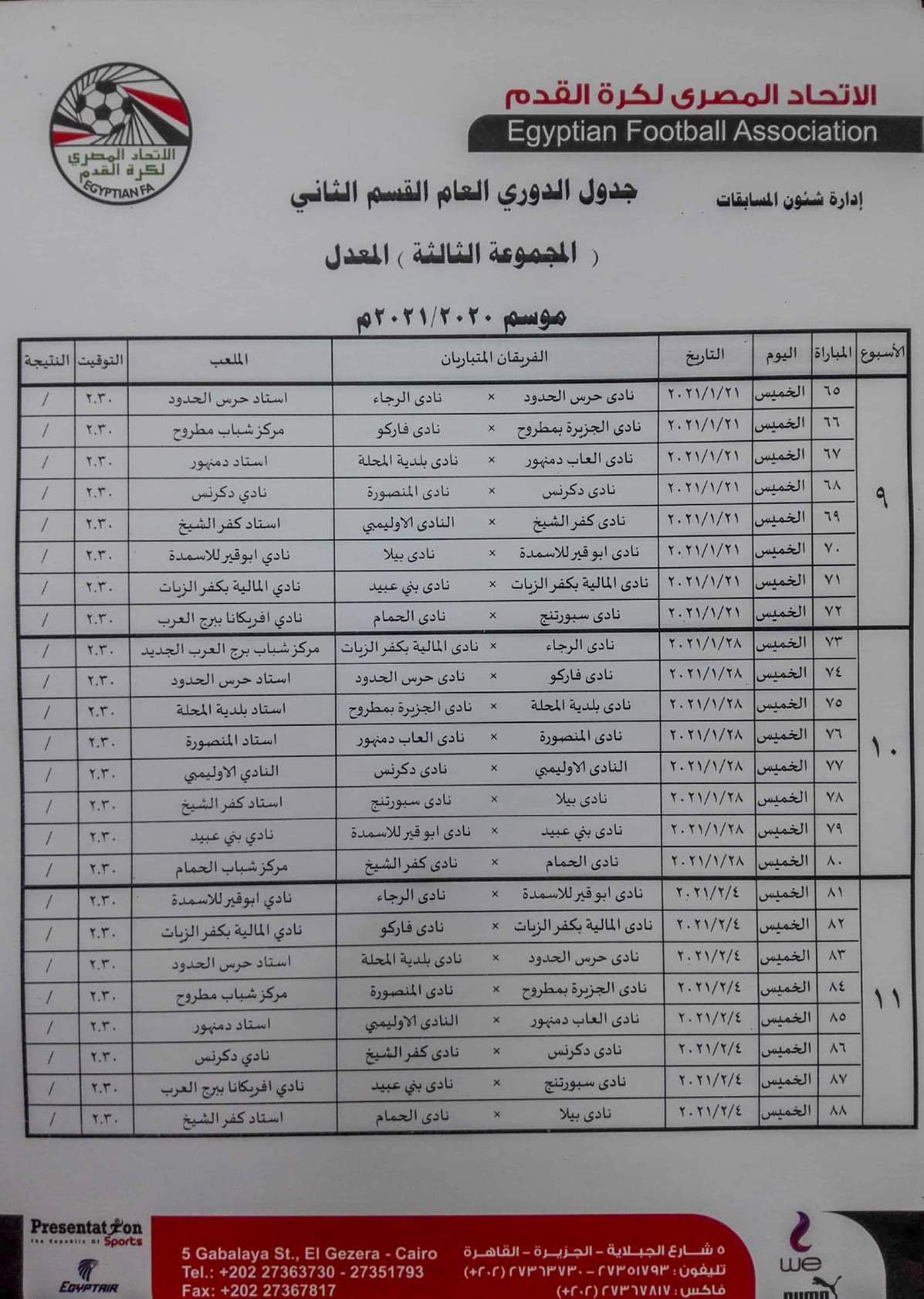 فيما جاءت مباريات المجموعة الثانية "القاهرة والقناة " كالتالي