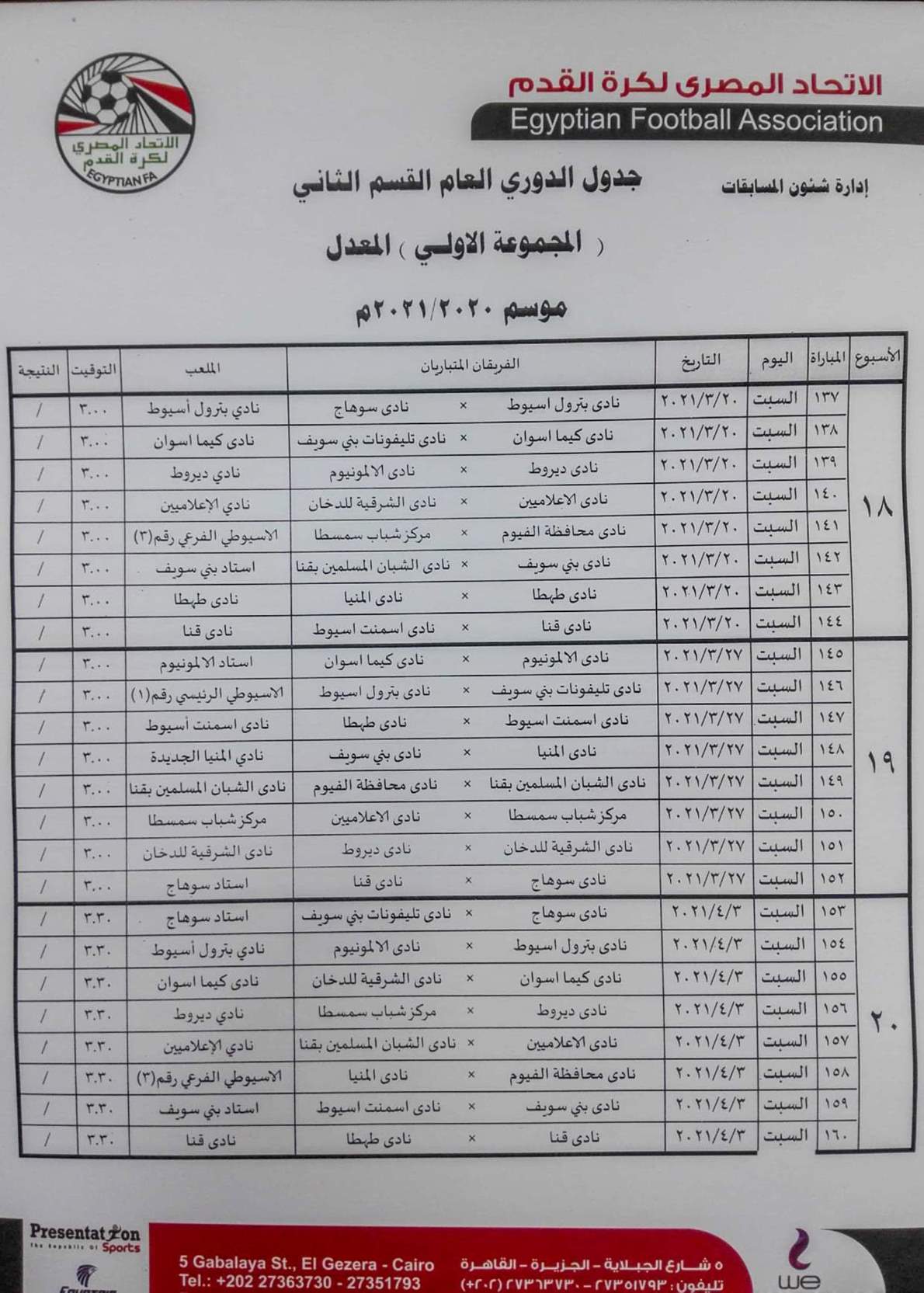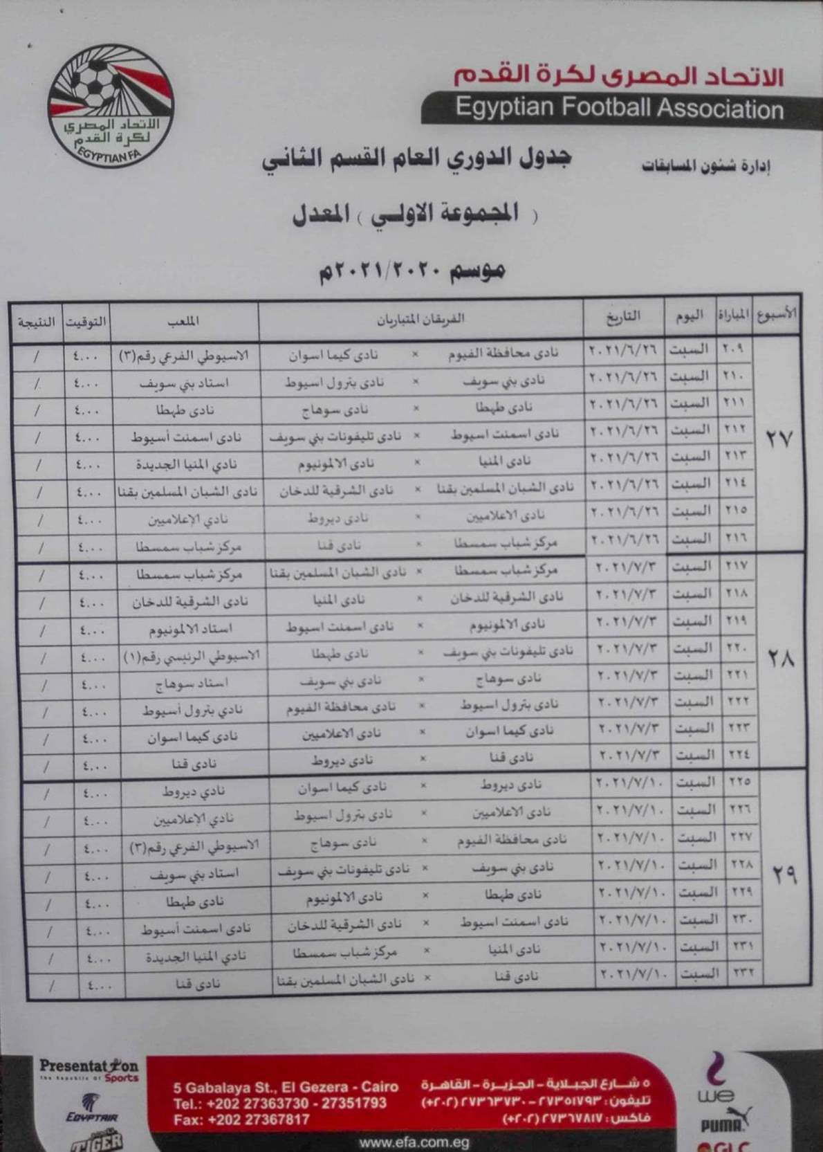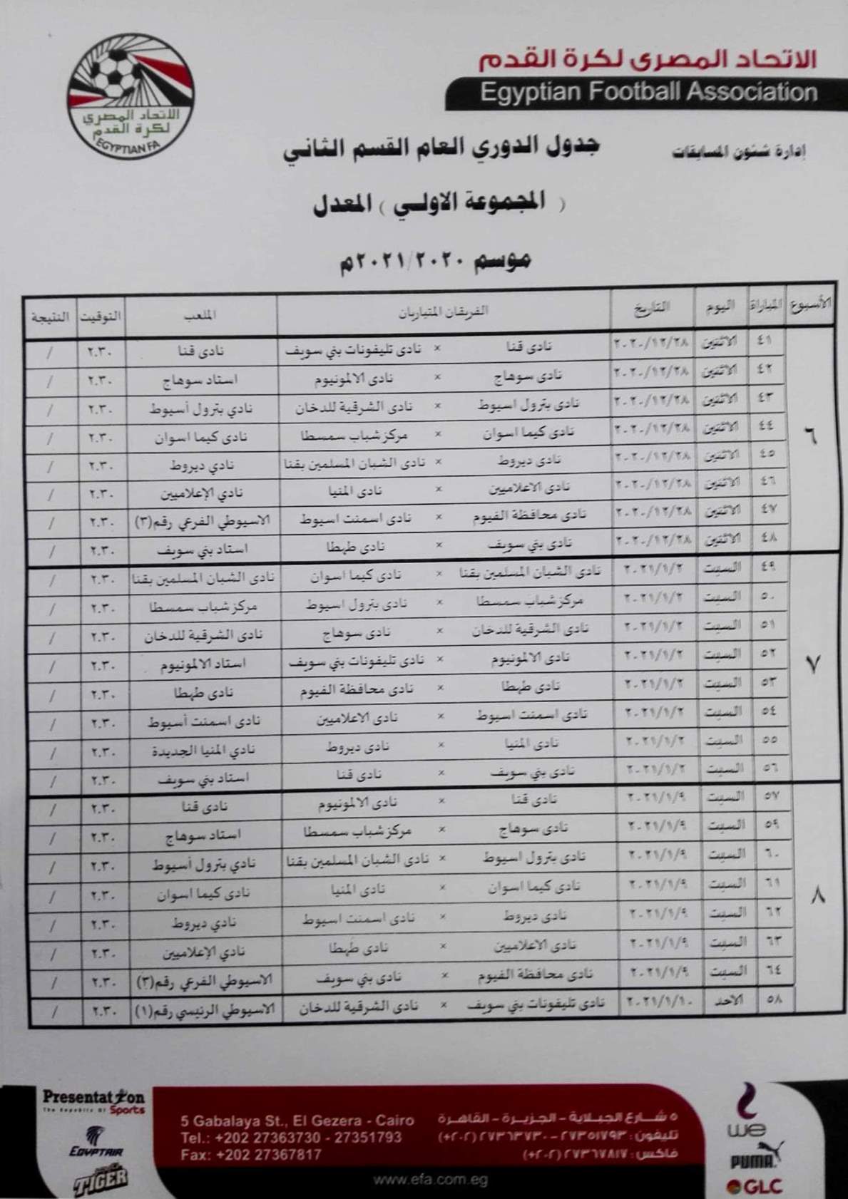 وجاء مباريات المجموعة الأولى "الصعيد" بمسابقة دوري القسم الثاني بعد تعديلها من الأسبوع السادس حتى نهاية البطولة كالتالي.