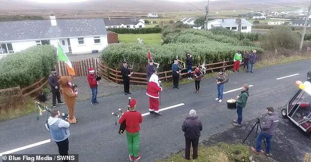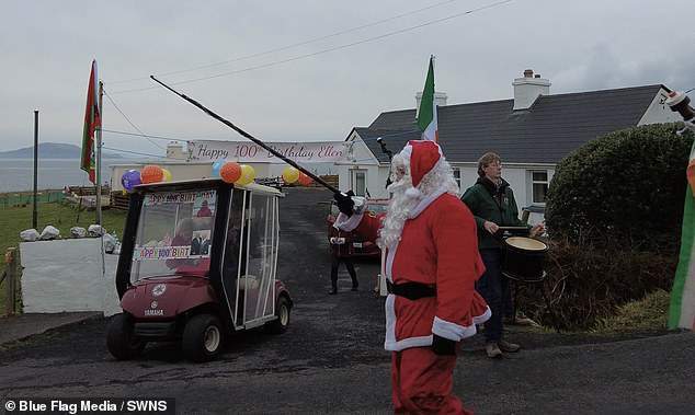 ووضع السكان المحليون الذين يرتدون زي "بابا نويل" السيدة العجوز التي تدعى إيلين داخل عربة صغيرة، وصاروا بها خارج المنزل في موكب ضخم يدور شوارع أيرلندا للاحتفال بعيد ميلادها.