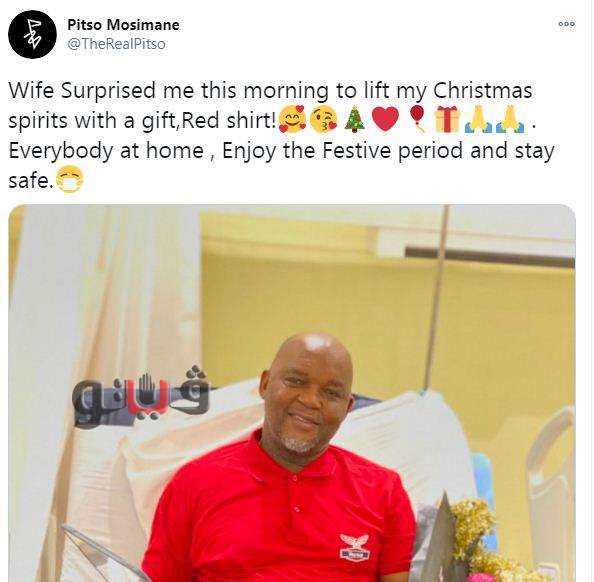 وغرد موسيماني على حسابه الرسمى بموقع "تويتر"، قائلا: "فاجأتني زوجتى هذا الصباح لرفع معنوياتي في عيد الميلاد بهدية.. قميص أحمر"، ووجه موسيمانى رسالة فى تغريدته يطالب فيها الجميع بالاحتفال بعيد الميلاد، ولكن من خلال البقاء فى المنزل.
