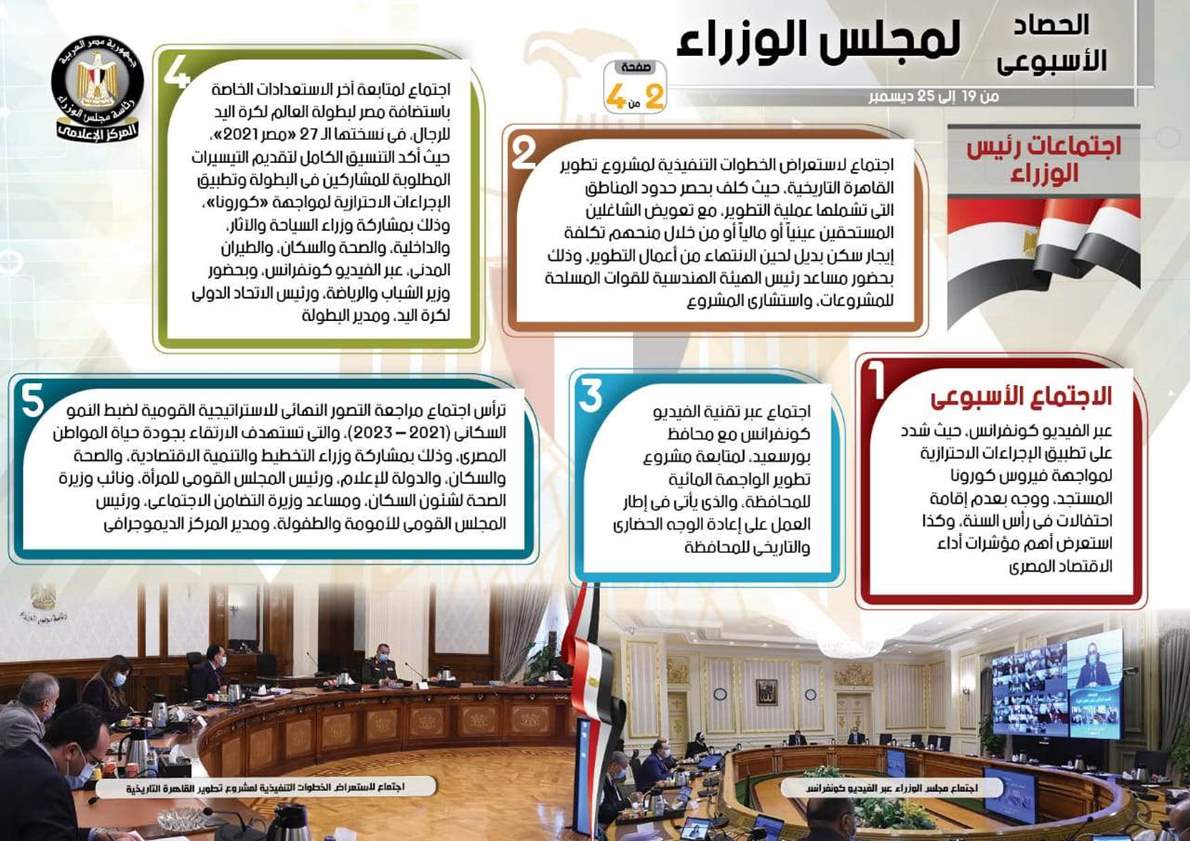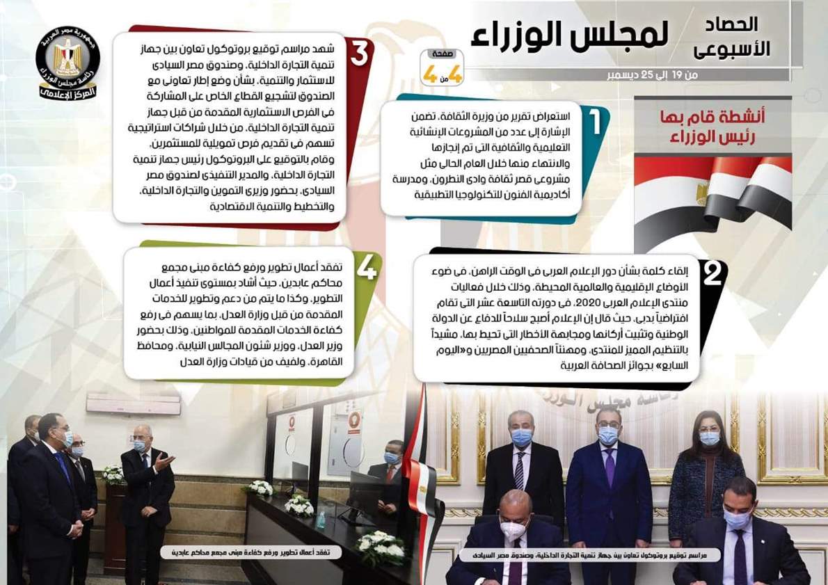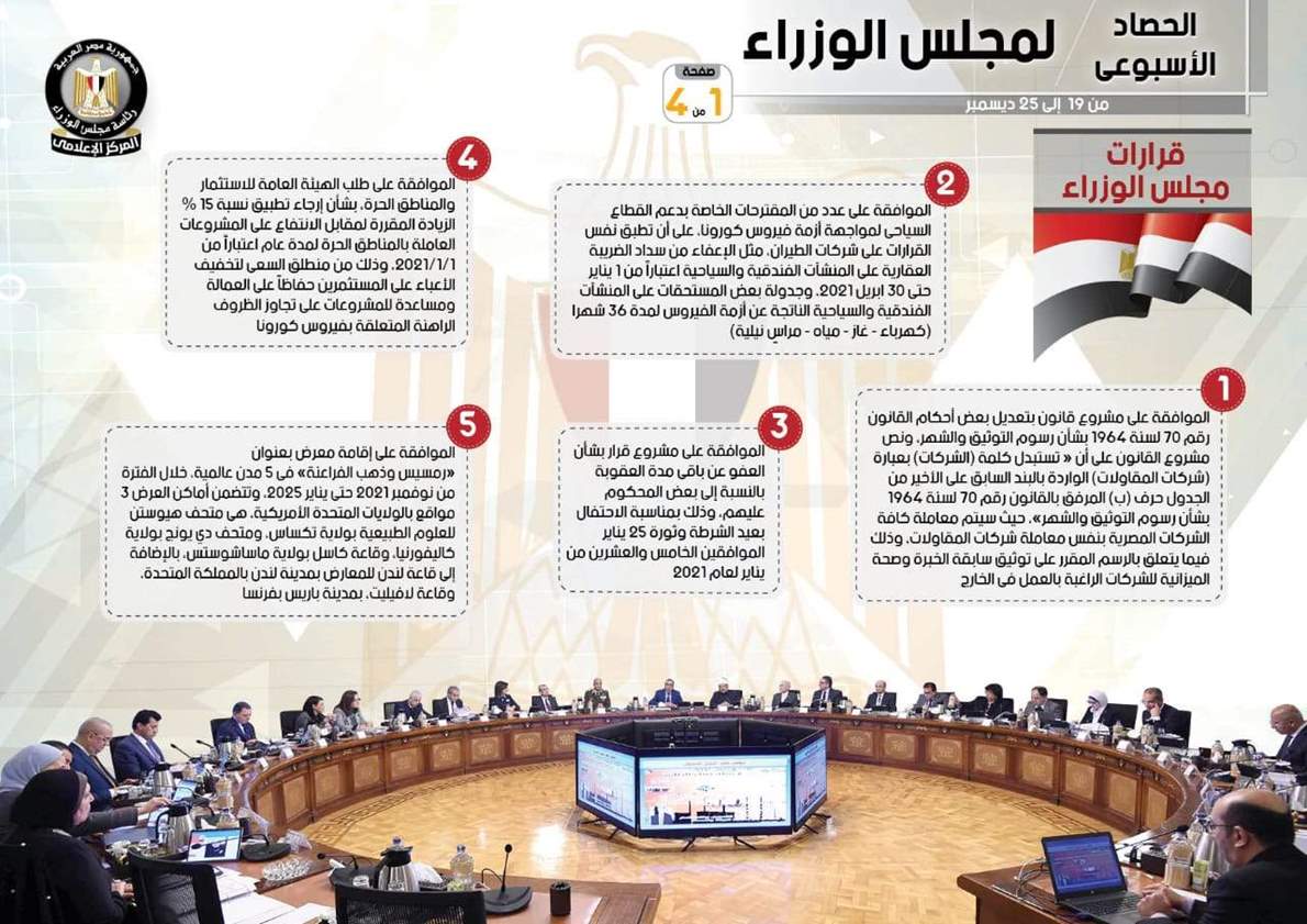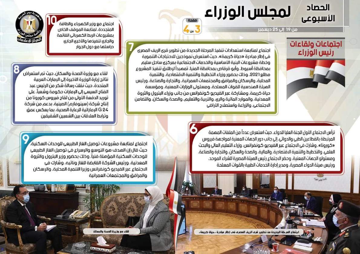 نشر المركز الإعلامي لمجلس الوزراء، تقريراً شمل إنفوجرافات سلط من خلالها الضوء على الحصاد الأسبوعي لمجلس الوزراء، وذلك خلال الفترة من 19 ديسمبر إلى 25 ديسمبر 2020، والذي تضمن الموافقة على عدد من القرارات.