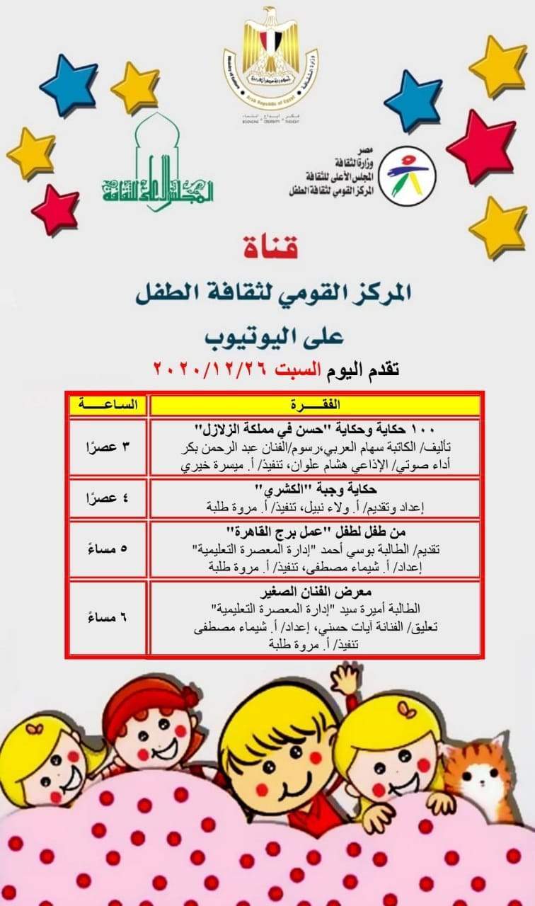 وننشر قائمة العروض والفعاليات المقرر إقامتها "أون لاين" اليوم السبت وأبرزها لقاء جديد ببرنامج 100 حكاية وحكاية و معرض الفنان الصغير: