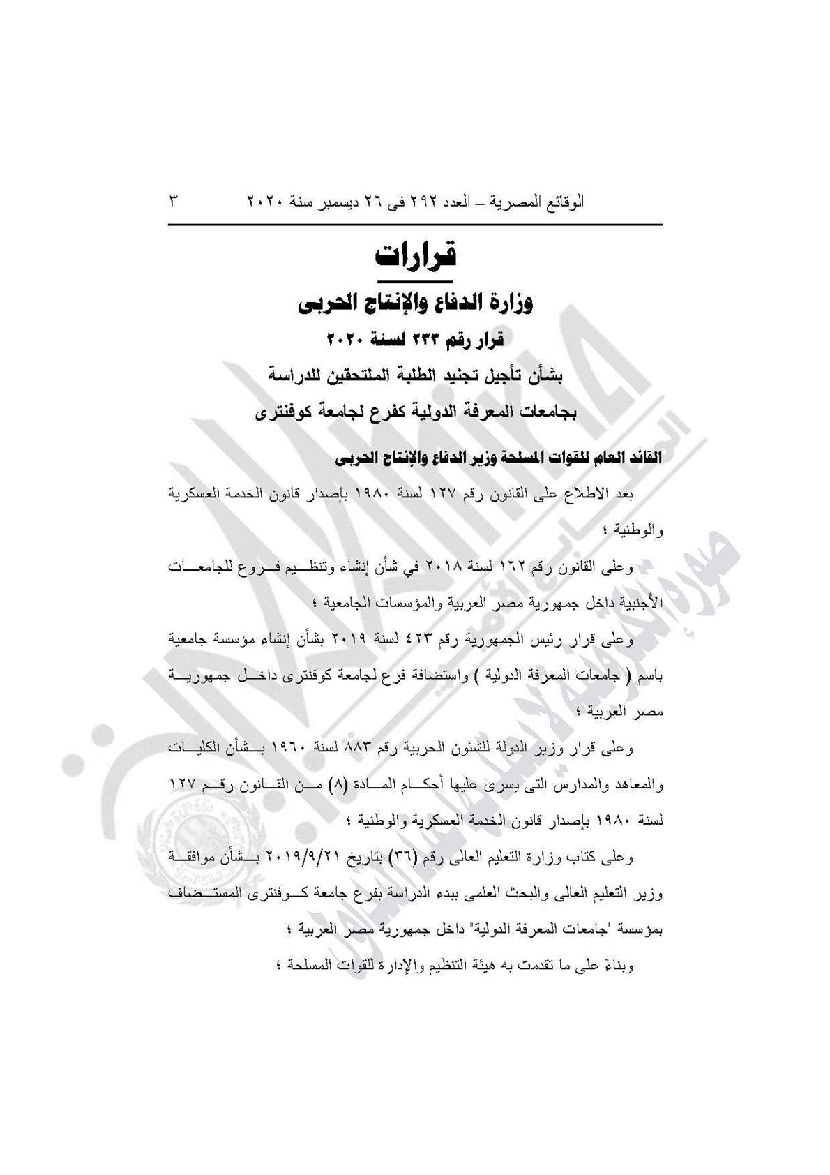 نشرت جريدة الوقائع المصرية في عددها رقم 292، الصادر 26 ديسمبر 2020، قرار وزارة الدفاع والإنتاج الحربي رقم 233 لسنة 2020، بشأن تأجيل تجنيد الطلبة الملتحقين للدراسة بجامعات المعرفة الدولية كفرع لجامعة كوفنترى.