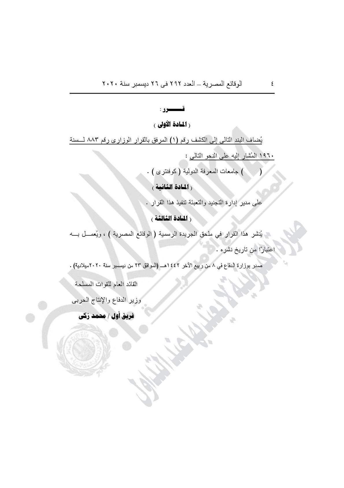 وينص القرار على تأجيل تجنيد الطلبة الملتحقين للدراسة بجامعات المعرفة الدولية كفرع لجامعة كوفنترى، حيث يضاف البند للكشف رقم (1) المرفق بالقرار رقم 883 لسنة 1960.