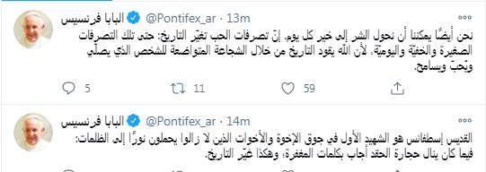 وكتب البابا فرنسيس تغريدة على تويتر "القديس إسطفانوس هو الشهيد الأول في جوق الإخوة والأخوات الذين لا زالوا يحملون نورًا إلى الظلمات: فيما كان ينال حجارة الحقد أجاب بكلمات المغفرة؛ وهكذا غيّر التاريخ".