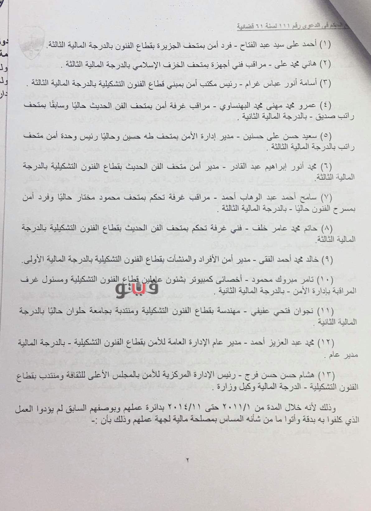 وتضمن الحكم في القضية رقم 111 لسنة 61 قضائية عليا خصم أجر 10 أيام من راتب أحمد علي السيد، مسئول أمن بمتحف الجزيرة التابع لقطاع الفنون التشكيلية، وبراءة كلًا من هاني محمد علي، مراقب فني بمتحف الخزف الإسلامي وأسامة أنور عباس، رئيس مكتب أمن بمبنى قطاع الفنون التشكيلية وعمرو محمد مهني، مراقب أمن بمتحف الفن الحديث وسعيد حسن علي، مدير أمن متحف طه حسين ومحمد أنور إبراهيم، مدير أمن متحف الفن الحديث وسامح أحمد عبد الوهاب، مراقب غرفة تحكم بمتحف محمود مختار وحاتم محمد عامر، بمتحف الفن الحديث